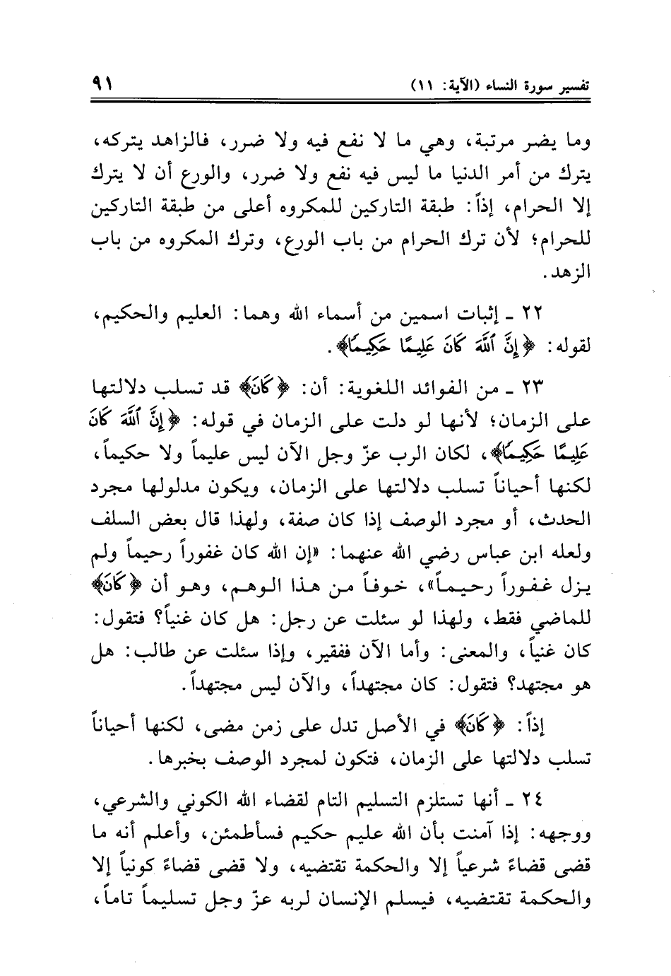 ٢٣ - من الفوائد اللغوية: أن: {كَانَ} قد تسلب دلالتها على الزمان؛ لأنها لو دلت على الزمان في قوله: {إِنَّ اللَّهَ كَانَ عَلِيمًا حَكِيمًا}، لكان الرب عزّ وجل الآن ليس عليمًا ولا حكيمًا، لكنها أحيانًا تسلب دلالتها على الزمان، ويكون مدلولها مجرد الحدث، أو مجرد الوصف إذا كان صفة، ولهذا قال بعض السلف ولعله ابن عباس رضي الله عنهما: "إن الله كان غفورًا رحيمًا ولم يزل غفورًا رحيمًا"، خوفًا من هذا الوهم، وهو أن {كَانَ} للماضي فقط، ولهذا لو سئلت عن رجل: هل كان غنيًا؟ فتقول: كان غنيًا، والمعنى: وأما الآن ففقير، وإذا سئلت عن طالب: هل هو مجتهد؟ فتقول: كان مجتهدًا، والآن ليس مجتهدًا.