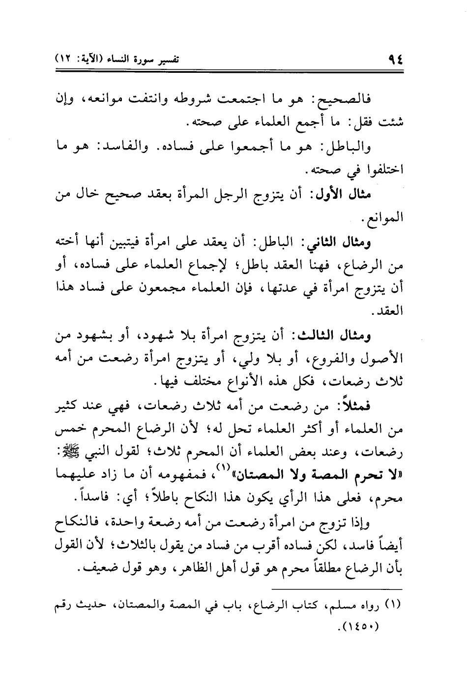 فمثلًا: من رضعت من أمه ثلاث رضعات، فهي عند كثير من العلماء أو أكثر العلماء تحل له؛ لأن الرضاع المحرم خمس رضعات، وعند بعض العلماء أن المحرم ثلاث؛ لقول النبي - صلى الله عليه وسلم -: "لا تحرم المصة ولا المصتان" (¬١)، فمفهومه أن ما زاد عليهما محرم، فعلى هذا الرأي يكون هذا النكاح باطلًا؛ أي: فاسدًا.