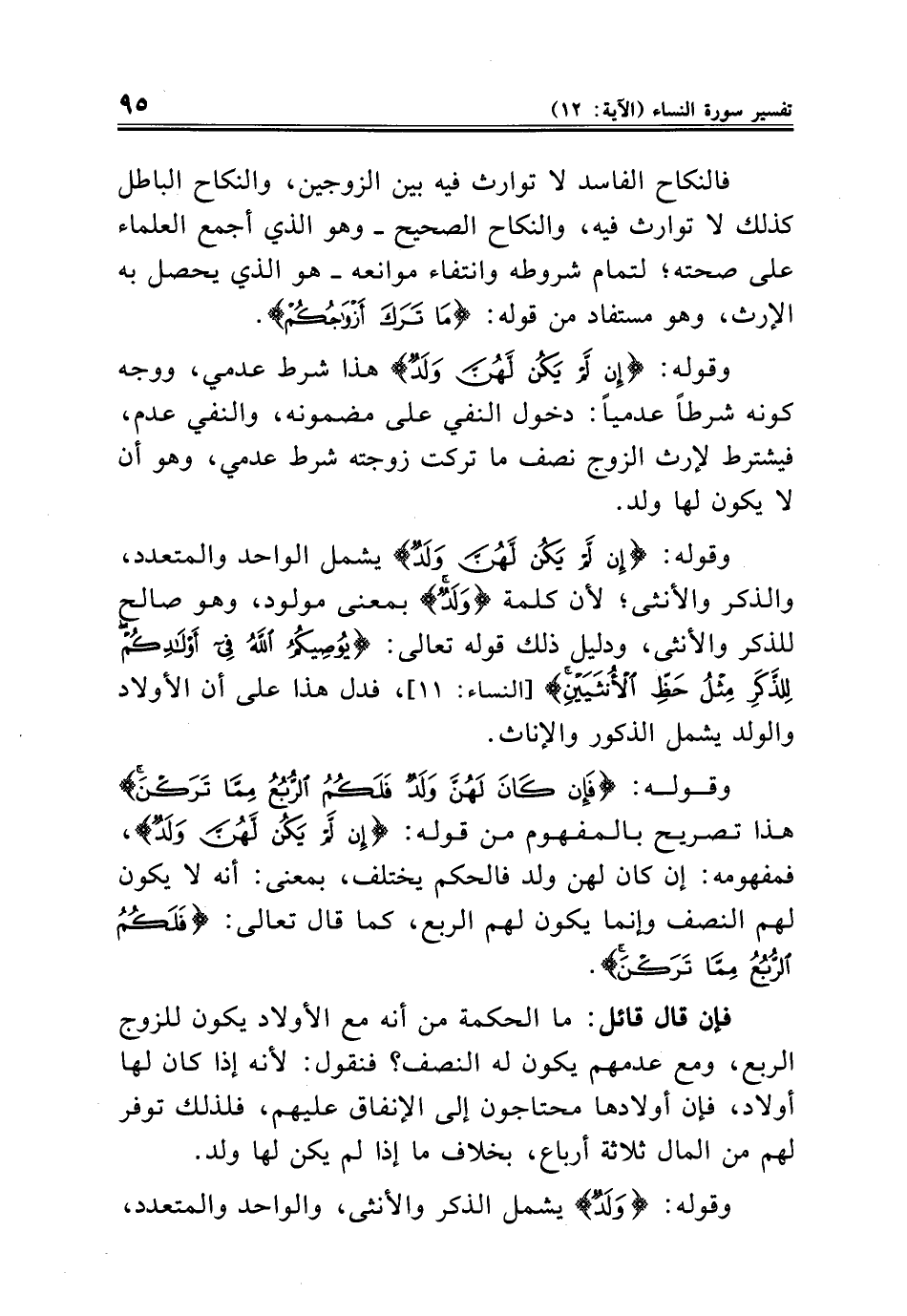وقوله: {فَإِنْ كَانَ لَهُنَّ وَلَدٌ فَلَكُمُ الرُّبُعُ مِمَّا تَرَكْنَ} هذا تصريح بالمفهوم من قوله: {إِنْ لَمْ يَكُنْ لَهُنَّ وَلَدٌ}، فمفهومه: إن كان لهن ولد فالحكم يختلف، بمعنى: أنه لا يكون لهم النصف وإنما يكون لهم الربع، كما قال تعالى: {فَلَكُمُ الرُّبُعُ مِمَّا تَرَكْنَ}.