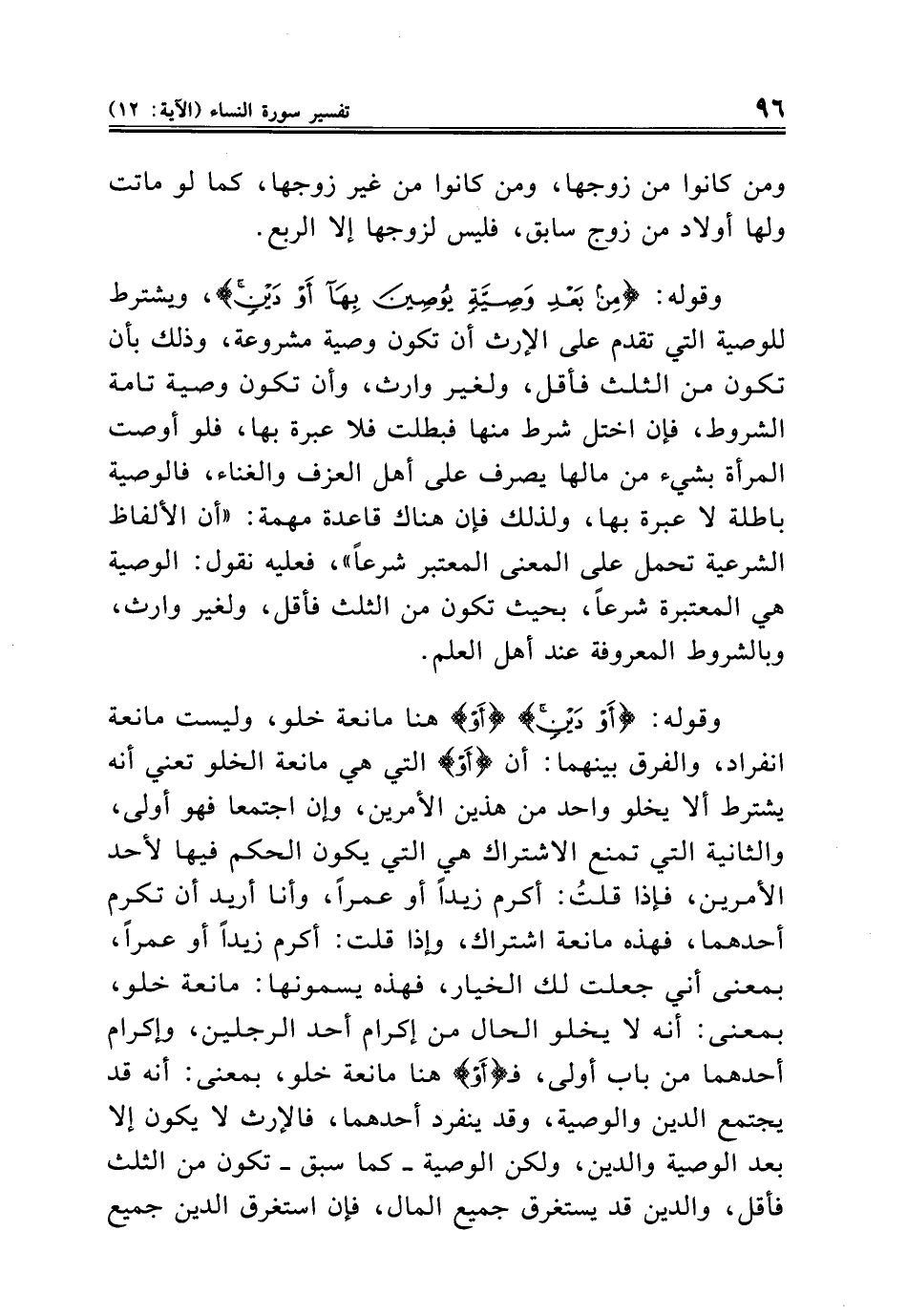 وقوله: {مِنْ بَعْدِ وَصِيَّةٍ يُوصِينَ بِهَا أَوْ دَيْنٍ}، ويشترط للوصية التي تقدم على الإرث أن تكون وصية مشروعة، وذلك بأن تكون من الثلث فأقل، ولغير وارث، وأن تكون وصية تامة الشروط، فإن اختل شرط منها فبطلت فلا عبرة بها، فلو أوصت المرأة بشيء من مالها يصرف على أهل العزف والغناء، فالوصية باطلة لا عبرة بها، ولذلك فإن هناك قاعدة مهمة: "أن الألفاظ الشرعية تحمل على المعنى المعتبر شرعًا"، فعليه نقول: الوصية هي المعتبرة شرعًا، بحيث تكون من الثلث فأقل، ولغير وارث، وبالشروط المعروفة عند أهل العلم.