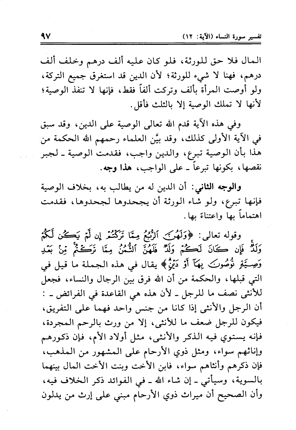 وقوله تعالى: {وَلَهُنَّ الرُّبُعُ مِمَّا تَرَكْتُمْ إِنْ لَمْ يَكُنْ لَكُمْ وَلَدٌ فَإِنْ كَانَ لَكُمْ وَلَدٌ فَلَهُنَّ الثُّمُنُ مِمَّا تَرَكْتُمْ مِنْ بَعْدِ وَصِيَّةٍ تُوصُونَ بِهَا أَوْ دَيْنٍ} يقال في هذه الجملة ما قيل في التي قبلها، والحكمة من أن الله فرق بين الرجال والنساء، فجعل للأنثى نصف ما للرجل - لأن هذه هي القاعدة في الفرائض-: أن الرجل والأنثى إذا كانا من جنس واحد فهما على التفريق، فيكون للرجل ضعف ما للأنثى، إلا من ورث بالرحم المجردة، فإنه يستوي فيه الذكر والأنثى، مثل أولاد الأم، فإن ذكورهم وإناثهم سواء، ومثل ذوي الأرحام على المشهور من المذهب، فإن ذكرهم وأنثاهم سواء، فابن الأخت وبنت الأخت المال بينهما بالسوية، وسيأتي - إن شاء الله - في الفوائد ذكر الخلاف فيه، وأن الصحيح أن ميراث ذوي الأرحام مبني على إرث من يدلون