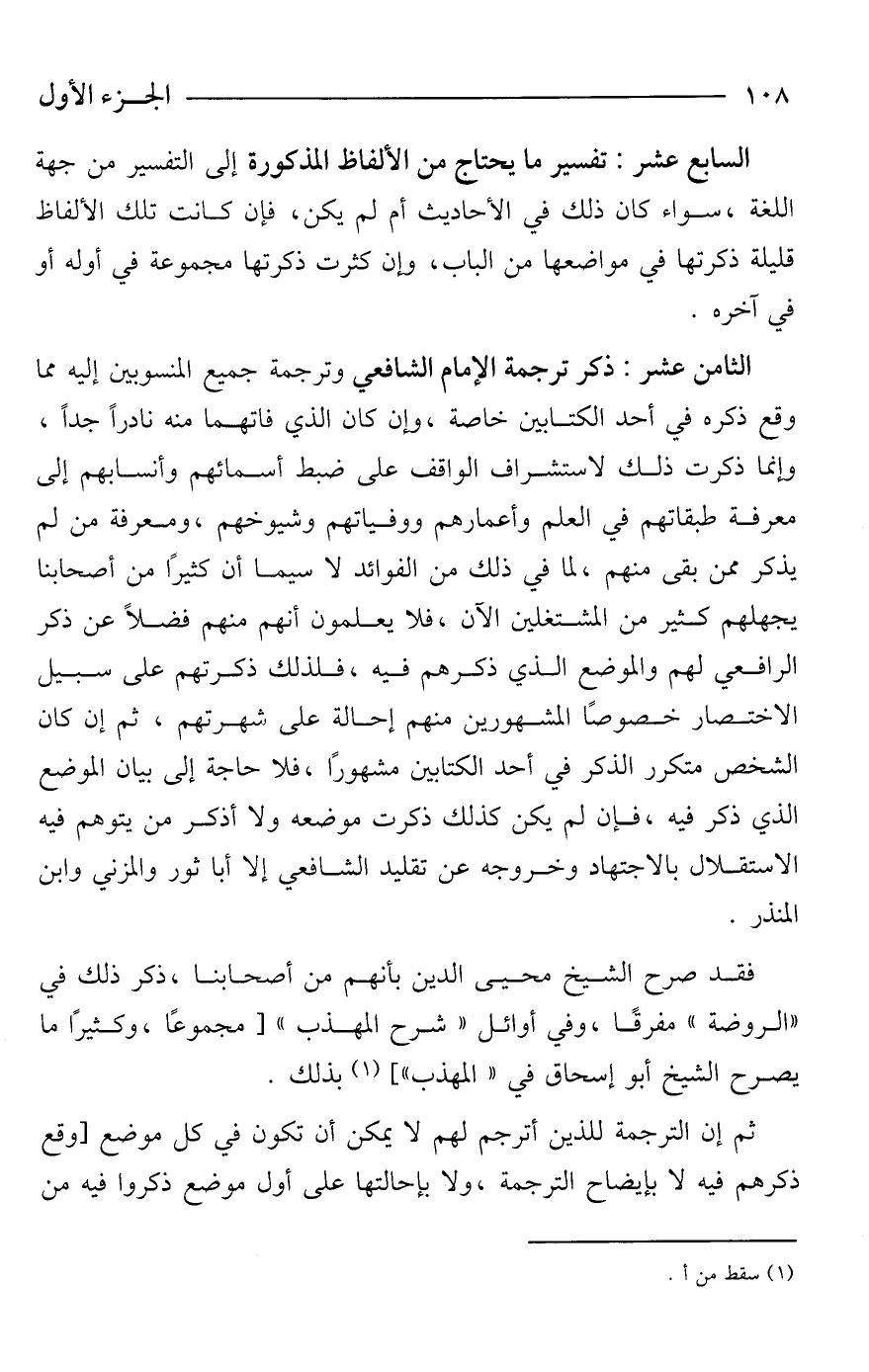 الثامن عشر: ذكر ترجمة الإمام الشافعي وترجمة جميع المنسوبين إليه مما وقع ذكره في أحد الكتابين خاصة، وإن كان الذي فاتهما منه نادرًا جدًا، وإنما ذكرت ذلك لاستشراف الواقف على ضبط أسمائهم وأنسابهم إلى معرفة طبقاتهم في العلم وأعمارهم ووفياتهم وشيوخهم، ومعرفة من لم يذكر ممن بقى منهم، لما في ذلك من الفوائد لاسيما أن كثيرًا من أصحابنا يجهلهم كثير من المشتغلين الآن، فلا يعلمون أنهم منهم فضلًا عن ذكر الرافعي لهم والموضع الذي ذكرهم فيه، فلذلك ذكرتهم على سبيل الاختصار خصوصًا المشهورين منهم إحالة على شهرتهم، ثم إن كان الشخص متكرر الذكر في أحد الكتابين مشهورًا، فلا حاجة إلى بيان الموضع الذي ذكر فيه، فإن لم يكن كذلك ذكرت موضعه ولا أذكر من يتوهم فيه الاستقلال بالاجتهاد وخروجه عن تقليد الشافعي إلا أبا ثور والمزني وابن المنذر.