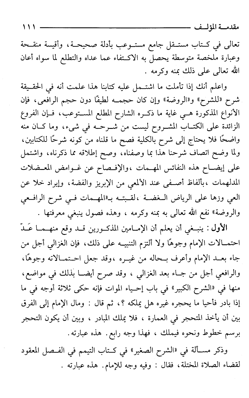 واعلم أنك إذا تأملت ما اشتمل عليه كتابنا هذا علمت أنه في الحقيقة شرح "للشرح" و"الروضة" وإن كان حجمه لطيفًا دون حجم الرافعى، فإن الأنواع المذكورة هي غاية ما ذكره الشارح المطلع المستوعب، فإن الفروع الزائدة على الكتاب المشروح ليست من شرحه في شئ، وما كان منه واضحًا فلا يحتاج إلى شرح بالكلية فصح ما قلناه من كونه شرحًا للكتابين، ولما وضح اتصاف شرحنا هذا بما وصفناه، وصح إطلاقه مما ذكرناه، واشتمل على إيضاح هذه النفائس المهمات، والإفصاح عن غوامض المعضلات المدلهمات، بألفاظ أصفى عند الألمعي من الإبريز والفضة، وإيراد خلا عن العي وزها على الرياض الغضة، لقبته بـ"المهمات في شرح الرافعي والروضة" نفع الله تعالى به بمنه وكرمه، وهذه فصول ينبغي معرفتها.