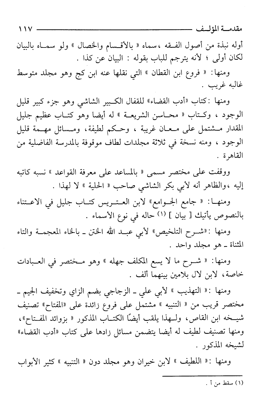 ومنها: كتاب "أدب القضاء" للقفال الكبير الشاشي وهو جزء كبير قليل الوجود، وكتاب "محاسن الشريعة" له أيضا وهو كتاب عظيم جليل المقدار مشتمل على معان غريبة، وحكم لطيفة، ومسائل مهمة قليل الوجود، ومنه نسخة فى ثلاثة مجلدات لطاف موقوفة بالمدرسة الفاضلية من القاهرة.