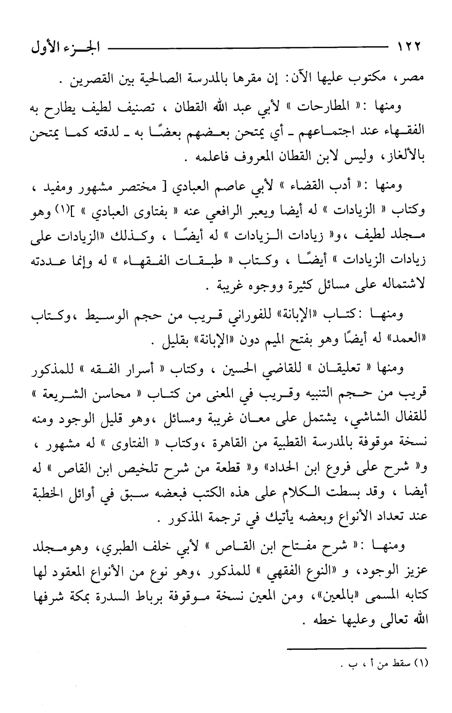 ومنها: "المطارحات" لأبي عبد الله القطان، تصنيف لطيف يطارح به الفقهاء عند اجتماعهم -أي يمتحن بعضهم بعضًا به- لدقته كما يمتحن بالألغاز، وليس لابن القطان المعروف فاعلمه.