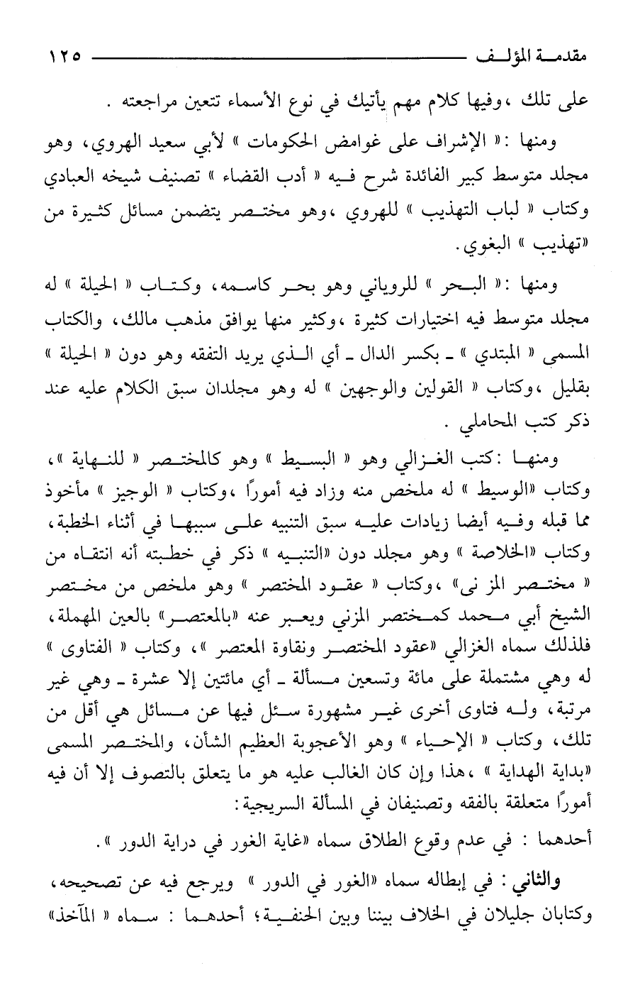 ومنها: "البحر" للروياني وهو بحر كاسمه، وكتاب "الحيلة" له مجلد متوسط فيه اختيارات كثيرة، وكثير منها يوافق مذهب مالك، والكتاب المسمى "المبتدي" -بكسر الدال- أي الذي يريد التفقه وهو دون "الحيلة" بقليل، وكتاب "القولين والوجهين" له وهو مجلدان سبق الكلام عليه عند ذكر كتب المحاملي.