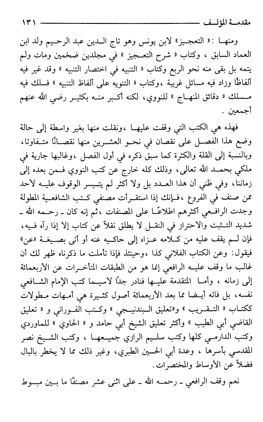 فهذه هي الكتب التي وقفت عليها، ونقلت منها بغير واسطة إلى حالة وضع هذا الفصل على نقصان في نحو العشرين منها نقصانًا متفاوتا، وبالنسبة إلى القلة والكثرة كما سبق ذكره في أول الفصل، وغالبها جارية في ملكي بحمد الله تعالى، وذلك كله خارج عن كتب النووي فمن بعده إلى زماننا، وفي ظني أن هذا العدد بل ولا أكثر لم يتيسر الوقوف عليه لأحد ممن صنف في الفروع، فإنك إذا استقرأت مصنفي كتب الشافعية المطولة وجدت الرافعي أكثرهم اطلاعًا على المصنفات، ثم إنه كان -رحمه الله- شديد التثبت والاحتراز في النقل لا يطلق نقلًا عن كتاب إلا إذا رآه فيه، فإن لم يقف عليه من كلامه عزاه إلى حاكيه عنه أو أتى بصيغة "عن" فيقول: وعن الكتاب الفلاني كذا، وحينئذ فإذا تأملت ما ذكرناه ظهر لك أن غالب ما وقف عليه الرافعي إنما هو من الطبقات المتأخرات عن الأربعمائة إلى زمانه، وأما المتقدمة عليها فنادر جدًا لاسيما كتب الإمام الشافعي نفسه، بل فاته أيضا مما بعد الأربعمائة أصول كثيرة هي أمهات مطولات ككتاب "التقريب" و"تعليق البندنيجي" وكتب الفوراني و"تعليق القاضي أبي الطيب" وكثر تعليق الشيخ أبي حامد و"الحاوي" للماوردي وكتب الدارمي كلها وكتب سليم الرازي جميعها، وكتب الشيخ نصر المقدسي بأسرها، وعدة أبي الحسين الطبري، وغير ذلك مما لا يخطر بالبال فضلًا عن الأوساط والمختصرات.
