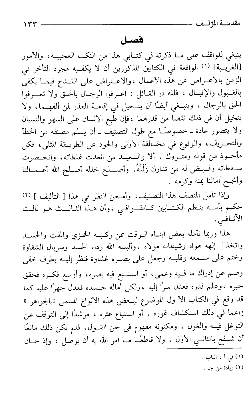 ينبغي للواقف على ما ذكرته في كتابي هذا من النكت العجبية، والأمور [الغريبة] (¬1) الواقعة في الكتابين المذكورين أن لا يكفيه مجرد التأخر في الزمن بالإعراض عن هذه الأعمال، والاعتراض على القدح فيما يكفى بالقبول والإقبال، فلله در القائل: اعرفوا الرجال بالحق ولا تعرفوا الحق بالرجال، وينبغي أيضًا أن يتحيل في إقامة العذر لمن ألفهما، ولا يتخيل أن في ذلك نقصا من قدرهما، فإن طبع الإنسان على السهو والنسيان ولا يتصور عادة -خصوصًا مع طول التصنيف- أن يسلم مصنفه من الخطأ والتحريف، والوقوع في مخالفة الأولى والحود عن الطريقة المثلى، فكل مأخوذ من قوله ومتروك، ألا والسعيد من انعدت غلطاته، وانحصرت سقطاته وقيض له من تدارك زَلَلَهُ، وأصلح خلله أصلح الله أعمالنا وأنجح آمالنا بمنه وكرمه.