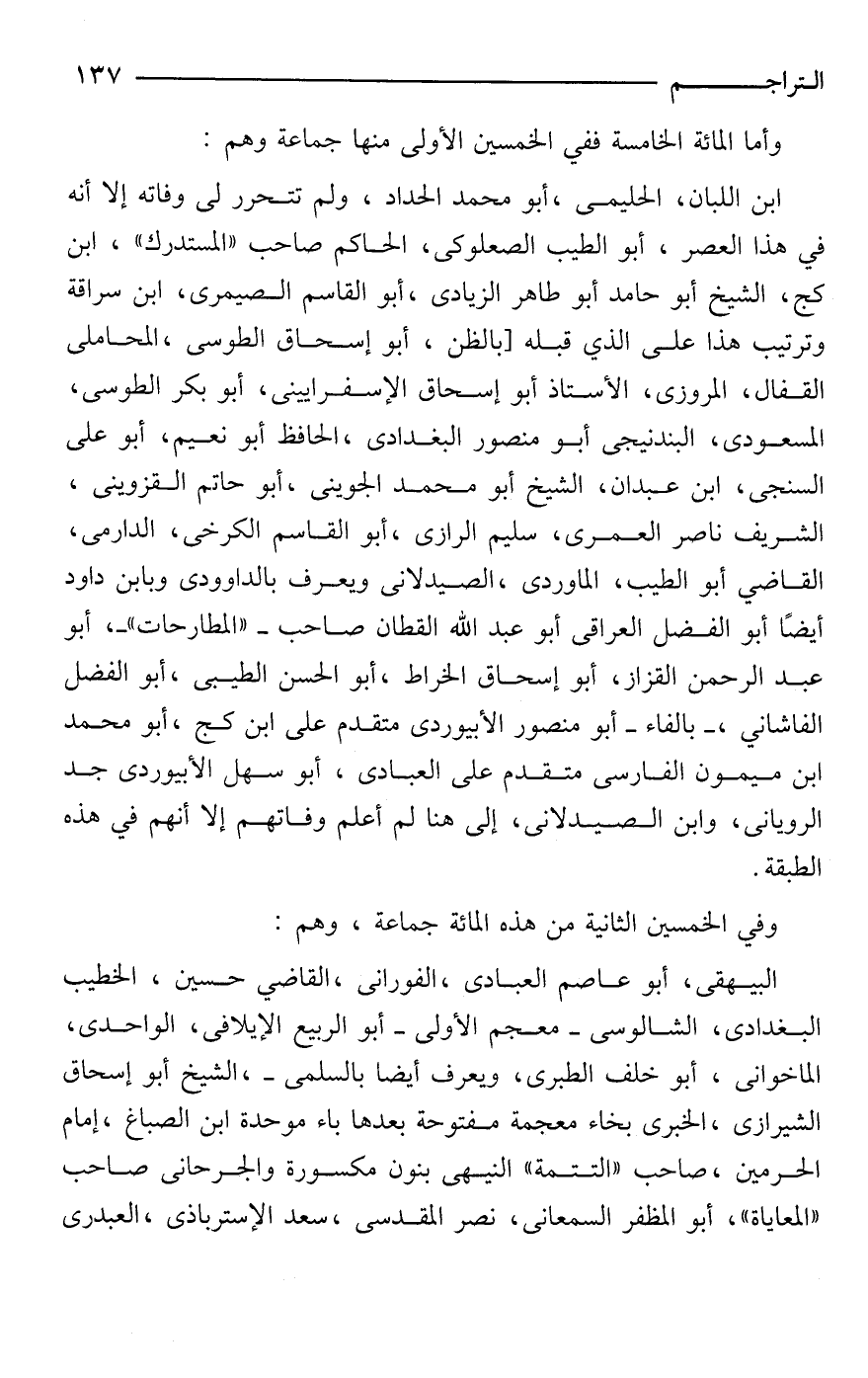 ابن اللبان، الحليمي، أَبو محمد الحداد، ولم تتحرر لى وفاته إلا أنه في هذا العصر، أَبو الطيب الصعلوكى، الحاكم صاحب "المستدرك"، ابن كج، الشيخ أَبو حامد أَبو طاهر الزيادي، أَبو القاسم الصيمري، ابن سراقة وترتيب هذا على الذي قبله [بالظن، أَبو إسحاق الطوسي، المحاملي القفال، المروزي، الأستاذ أَبو إسحاق الإسفراييني، أَبو بكر الطوسي، المسعودي، البندنيجي أَبو منصور البغدادي، الحافظ أَبو نعيم، أَبو علي السنجي، ابن عبدان، الشيخ أَبو محمد الجويني، أَبو حاتم القزوينى، الشريف ناصر العمرى، سليم الرازى، أَبو القاسم الكرخى، الدارمى، القاضي أَبو الطيب، الماوردى، الصيدلانى ويعرف بالداوودى وبابن داود أيضًا أَبو الفضل العراقى أَبو عبد الله القطان صاحب -"المطارحات"-، أَبو عبد الرحمن القزاز، أَبو إسحاق الخراط، أَبو الحسن الطيبى، أَبو الفضل الفاشاني، -بالفاء- أَبو منصور الأبيوردى متقدم على ابن كج، أَبو محمد ابن ميمون الفارسى متقدم على العبادي، أَبو سهل الأبيوردي جد الرويانى، وابن الصيدلانى، إلى هنا لم أعلم وفاتهم إلا أنهم في هذه الطبقة.