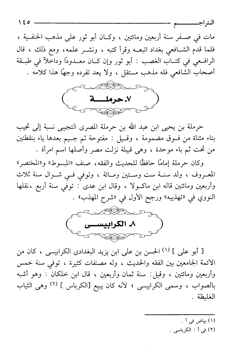 [أَبو على] (¬1) الحسن بن على ابن يزيد البغدادى الكرابيسى، كان من الأئمة الجامعين بين الفقه والحديث، وله مصنفات كثيرة، توفي سنة خمس وأربعين ومائتين، وقيل: سنة ثمان وأربعين، قال ابن خلكان: وهو أشبه بالصواب، وسمى الكرابيسى؛ لأنه كان يبيع [الكرباس] (¬2) وهى الثياب الغليظة.