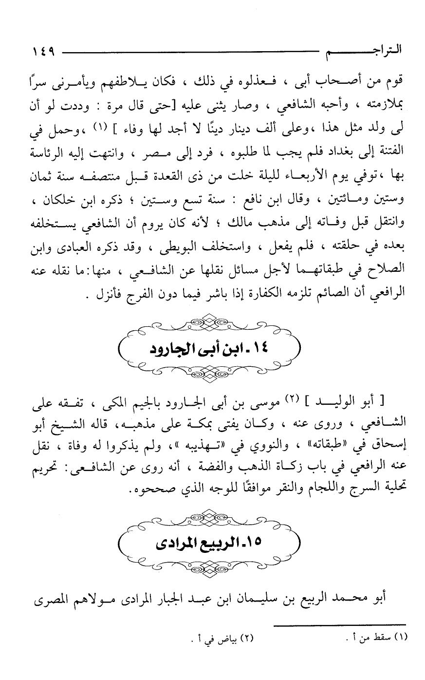 قوم من أصحاب أَبي، فعذلوه في ذلك، فكان يلاطفهم ويأمرنى سرًا بملازمته، وأحبه الشافعي، وصار يثنى عليه [حتى قال مرة: وددت لو أن لى ولد مثل هذا، وعلى ألف دينار دينًا لا أجد لها وفاء] (¬1)، وحمل في الفتنة إلى بغداد فلم يجب لما طلبوه، فرد إلى مصر، وانتهت إليه الرئاسة بها، توفي يوم الأربعاء لليلة خلت من ذى القعدة قبل منتصفه سنة ثمان وستين ومائتين، وقال ابن نافع: سنة تسع وستين؛ ذكره ابن خلكان، وانتقل قبل وفاته إلى مذهب مالك؛ لأنه كان يروم أن الشافعي يستخلفه بعده في حلقته، فلم يفعل، واستخلف البويطى، وقد ذكره العبادى وابن الصلاح في طبقاتهما لأجل مسائل نقلها عن الشافعي، منها: ما نقله عنه الرافعي أن الصائم تلزمه الكفارة إذا باشر فيما دون الفرج فأنزل.