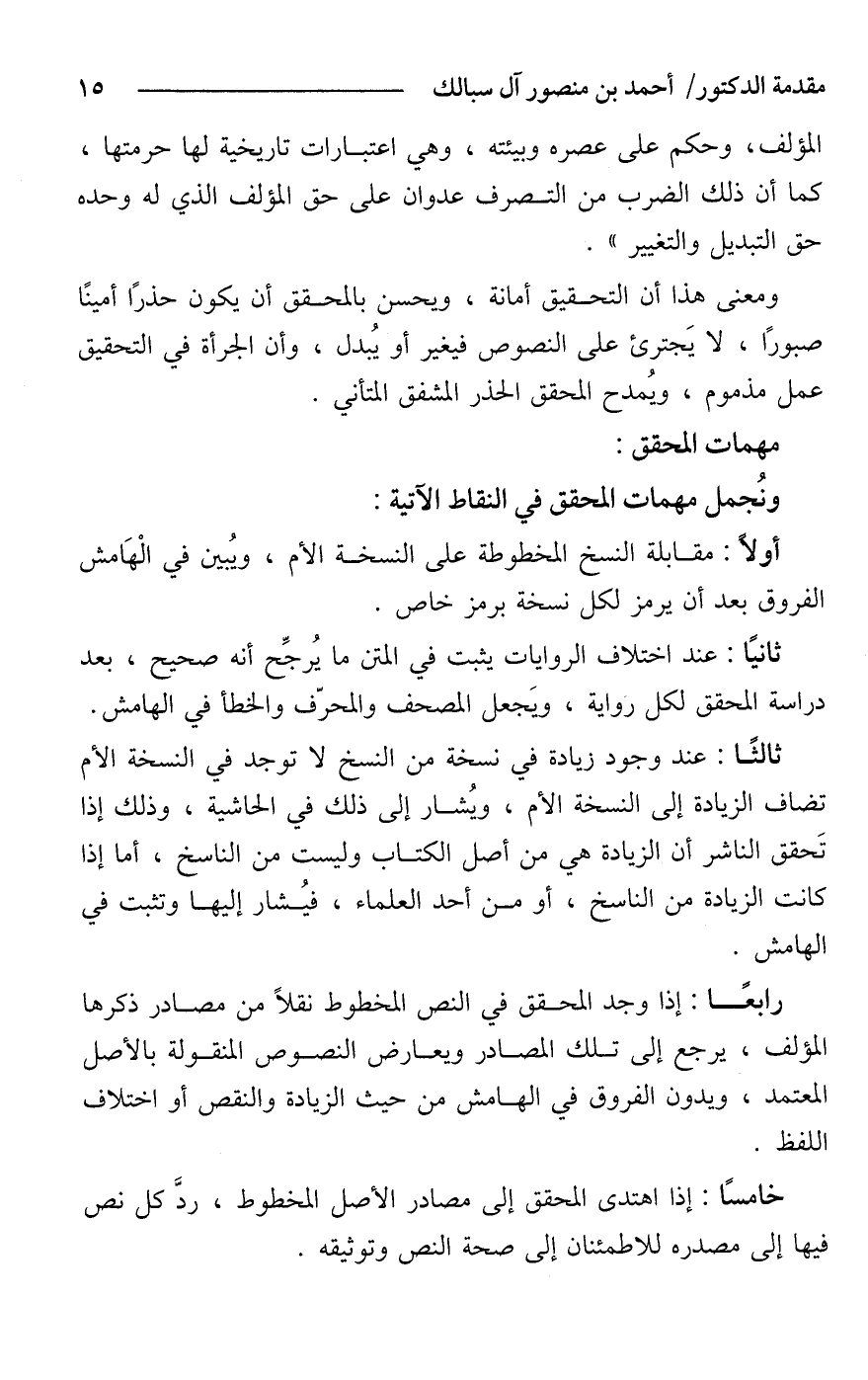 أولًا: مقابلة النسخ المخطوطة على النسخة الأم، ويُبين في الْهَامش الفروق بعد أن يرمز لكل نسخة برمز خاص.