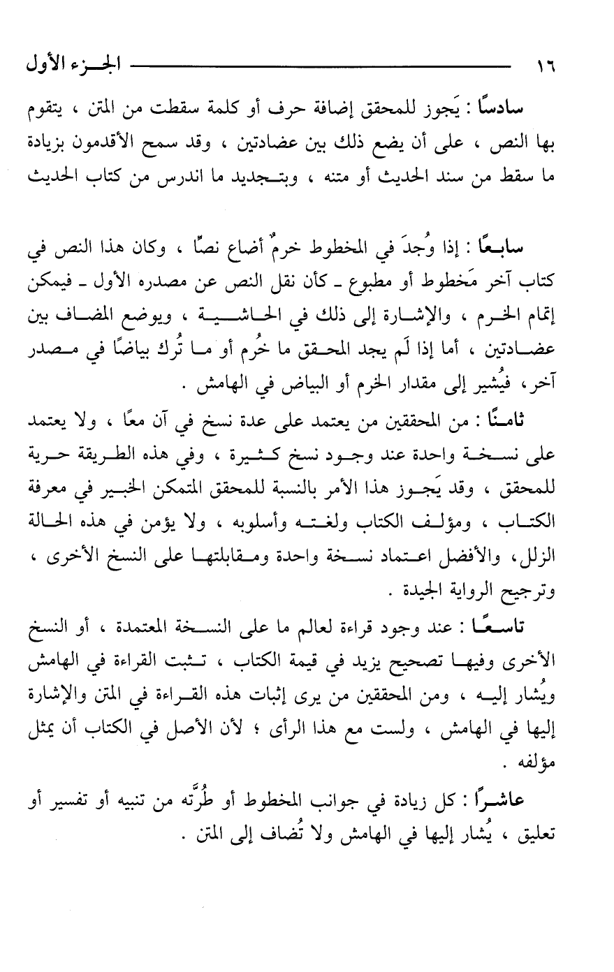 سادسًا: يَجوز للمحقق إضافة حرف أو كلمة سقطت من المتن، يتقوم بها النص، على أن يضع ذلك بين عضادتين، وقد سمح الأقدمون بزيادة ما سقط من سند الحديث أو متنه، وبتجديد ما اندرس من كتاب الحديث