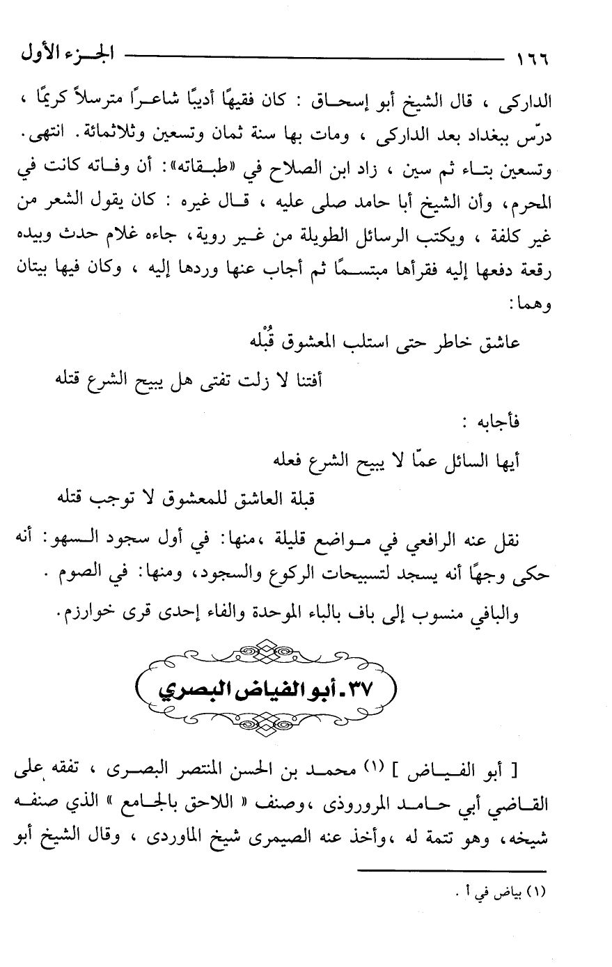 الداركى، قال الشيخ أَبو إسحاق: كان فقيهًا أديبًا شاعرًا مترسلًا كريمًا، درّس ببغداد بعد الداركى، ومات بها سنة ثمان وتسعين وثلاثمائة. انتهى. وتسعين بتاء ثم سين، زاد ابن الصلاح في "طبقاته": أن وفاته كانت في المحرم، وأن الشيخ أبا حامد صلى عليه، قال غيره: كان يقول الشعر من غير كلفة، ويكتب الرسائل الطويلة من غير روية، جاءه غلام حدث وبيده رقعة دفعها إليه فقرأها مبتسمًا ثم أجاب عنها وردها إليه، وكان فيها بيتان وهما:
