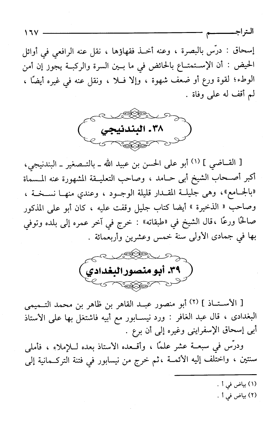 إسحاق: درّس بالبصرة، وعنه أخذ فقهاؤها، نقل عنه الرافعي في أوائل الحيض: أن الإستمتاع بالحائض في ما بين السرة والركبة يجوز إن أمن الوطء؛ لقوة ورع أو ضعف شهوة، وإلا فلا، ونقل عنه في غيره أيضًا، لم أقف له على وفاة.