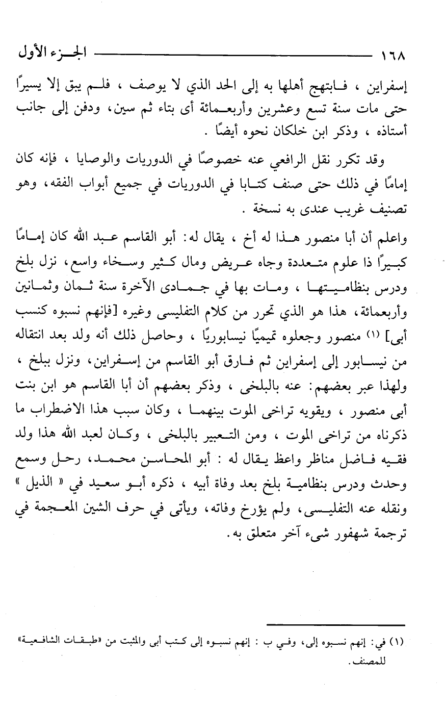 واعلم أن أبا منصور هذا له أخ، يقال له: أَبو القاسم عبد الله كان إمامًا كبيرًا ذا علوم متعددة وجاه عريض ومال كثير وسخاء واسع، نزل بلخ ودرس بنظاميتها، ومات بها في جمادى الآخرة سنة ثمان وثمانين وأربعمائة، هذا هو الذي تحرر من كلام التفليسى وغيره [فإنهم نسبوه كنسب أَبي] (¬1) منصور وجعلوه تميميًا نيسابوريًا، وحاصل ذلك أنه ولد بعد انتقاله من نيسابور إلى إسفراين ثم فارق أَبو القاسم من إسفراين، ونزل ببلخ، ولهذا عبر بعضهم: عنه بالبلخى، وذكر بعضهم أن أبا القاسم هو ابن بنت أَبي منصور، ويقويه تراخى الموت بينهما، وكان سبب هذا الاضطراب ما ذكرناه من تراخى الموت، ومن التعبير بالبلخى، وكان لعبد الله هذا ولد فقيه فاضل مناظر واعظ يقال له: أَبو المحاسن محمد، رحل وسمع وحدث ودرس بنظامية بلخ بعد وفاة أبيه، ذكره أَبو سعيد في "الذيل" ونقله عنه التفليسى، ولم يؤرخ وفاته، ويأتى في حرف الشين المعجمة في ترجمة شهفور شئ آخر متعلق به.