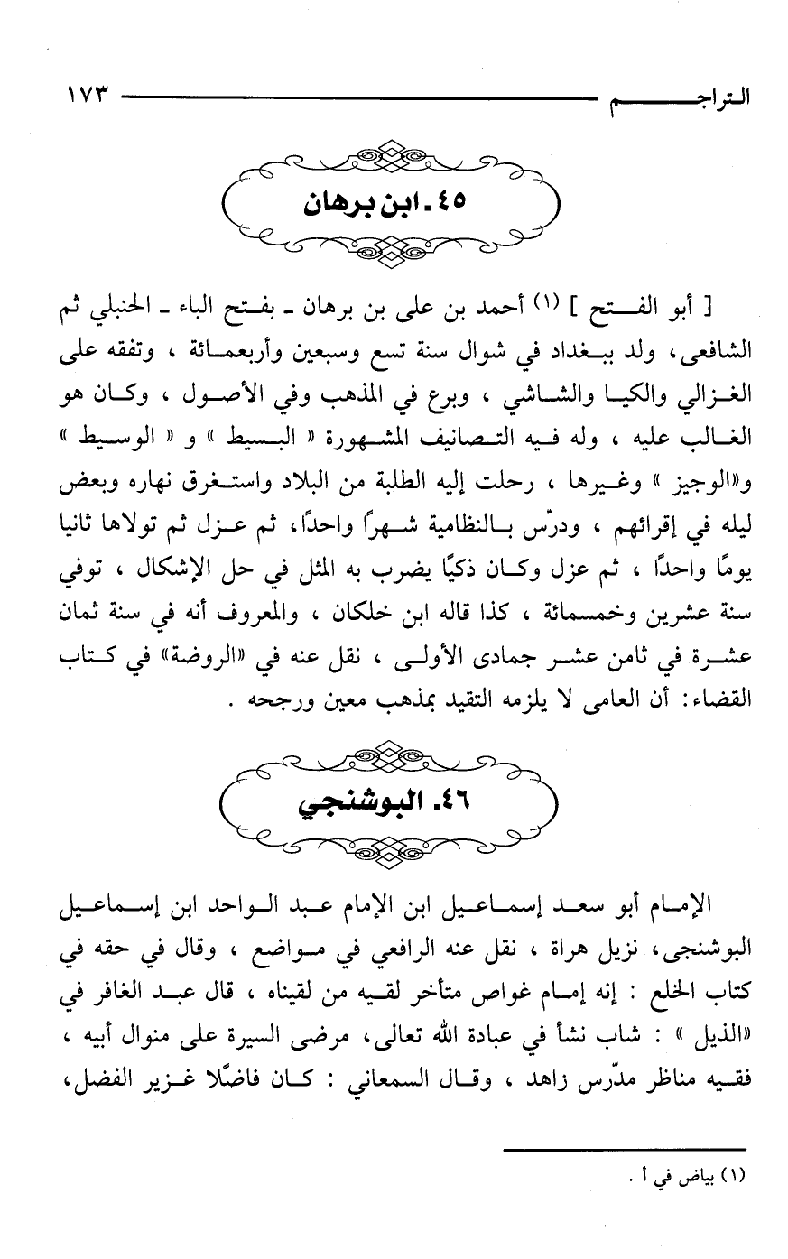 [أَبو الفتح] (¬1) أحمد بن على بن برهان -بفتح الباء- الحنبلي ثم الشافعي، ولد ببغداد في شوال سنة تسع وسبعين وأربعمائة، وتفقه على الغزالي والكيا والشاشي، وبرع في المذهب وفي الأصول، وكان هو الغالب عليه، وله فيه التصانيف المشهورة "البسيط" و"الوسيط" و"الوجيز" وغيرها، رحلت إليه الطلبة من البلاد واستغرق نهاره وبعض ليله في إقرائهم، ودرّس بالنظامية شهرًا واحدًا، ثم عزل ثم تولاها ثانيا يومًا واحدًا، ثم عزل وكان ذكيًا يضرب به المثل في حل الإشكال، توفي سنة عشرين وخمسمائة، كذا قاله ابن خلكان، والمعروف أنه في سنة ثمان عشرة في ثامن عشر جمادى الأولى، نقل عنه في "الروضة" في كتاب القضاء: أن العامى لا يلزمه التقيد بمذهب معين ورجحه.