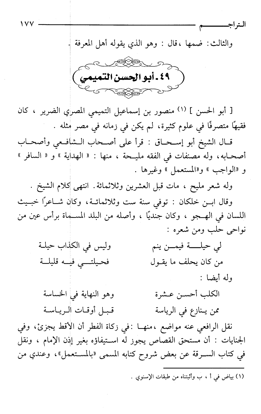 [أَبو الحسن] (¬1) منصور بن إسماعيل التميمي المصري الضرير، كان فقيهًا متصرفًا في علوم كثيرة، لم يكن في زمانه في مصر مثله.