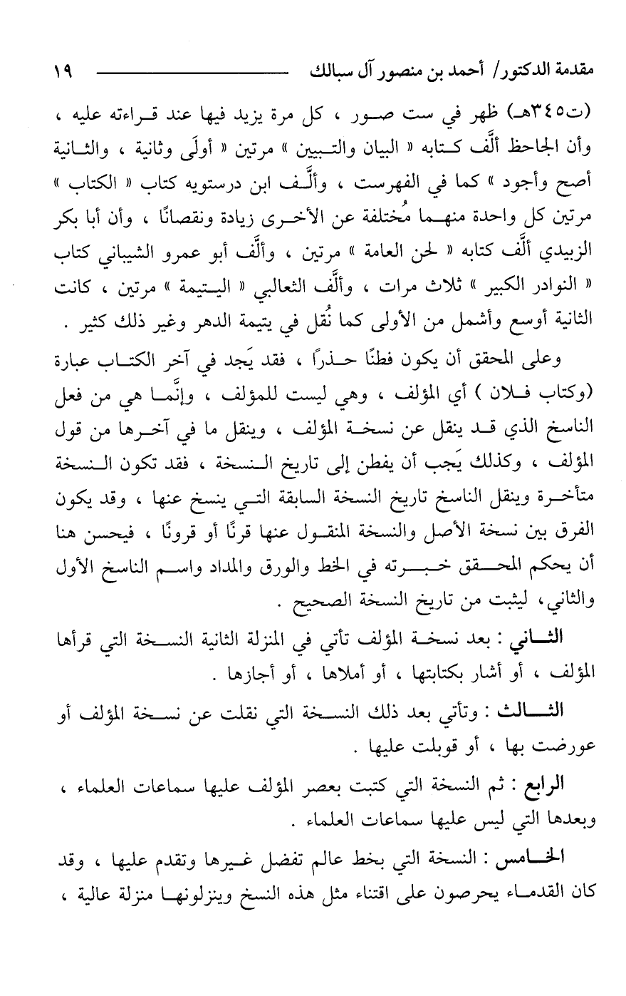 (ت 345 هـ) ظهر في ست صور، كل مرة يزيد فيها عند قراءته عليه، وأن الجاحظ ألَّف كتابه "البيان والتبيين" مرتين "أولَى وثانية، والثانية أصح وأجود" كما في الفهرست، وألَّف ابن درستويه كتاب "الكتاب" مرتين كل واحدة منهما مُختلفة عن الأخرى زيادة ونقصانًا، وأن أبا بكر الزبيدي ألَّف كتابه "لحن العامة" مرتين، وألَّف أَبو عمرو الشيباني كتاب "النوادر الكبير" ثلاث مرات، وألَّف الثعالبي "اليتيمة" مرتين، كانت الثانية أوسع وأشمل من الأولى كما نُقل في يتيمة الدهر وغير ذلك كثير.