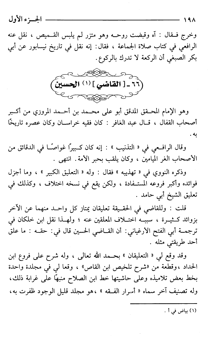 قلت: وللقاضي في الحقيقة تعليقان يمتاز كل واحد منهما عن الآخر بزوائد كثيرة، سببه اختلاف المعلقين عنه؛ ولهذا نقل ابن خلكان في ترجمة أبي الفتح الأرغياني: أن القاضي الحسين قال في: حقه: ما علق أحد طريقتي مثله.