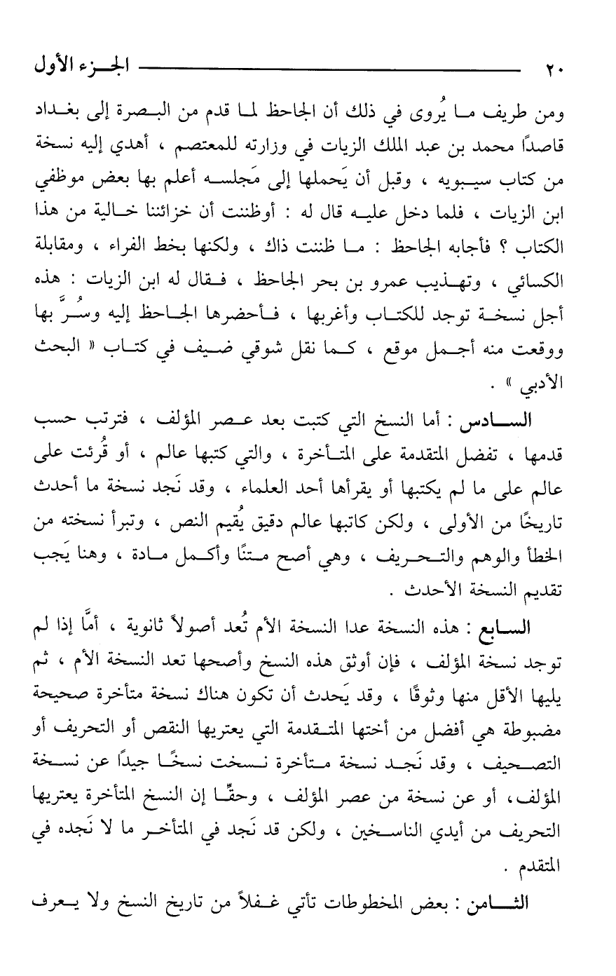 السابع: هذه النسخة عدا النسخة الأم تُعد أصولًا ثانوية، أمَّا إذا لم توجد نسخة المؤلف، فإن أوثق هذه النسخ وأصحها تعد النسخة الأم، ثم يليها الأقل منها وثوقًا، وقد يَحدث أن تكون هناك نسخة متأخرة صحيحة مضبوطة هي أفضل من أختها المتقدمة التي يعتريها النقص أو التحريف أو التصحيف، وقد نَجد نسخة متأخرة نسخت نسخًا جيدًا عن نسخة المؤلف، أو عن نسخة من عصر المؤلف، وحقّا إن النسخ المتأخرة يعتريها التحريف من أيدي الناسخين، ولكن قد نَجد في المتأخر ما لا نَجده في المتقدم.