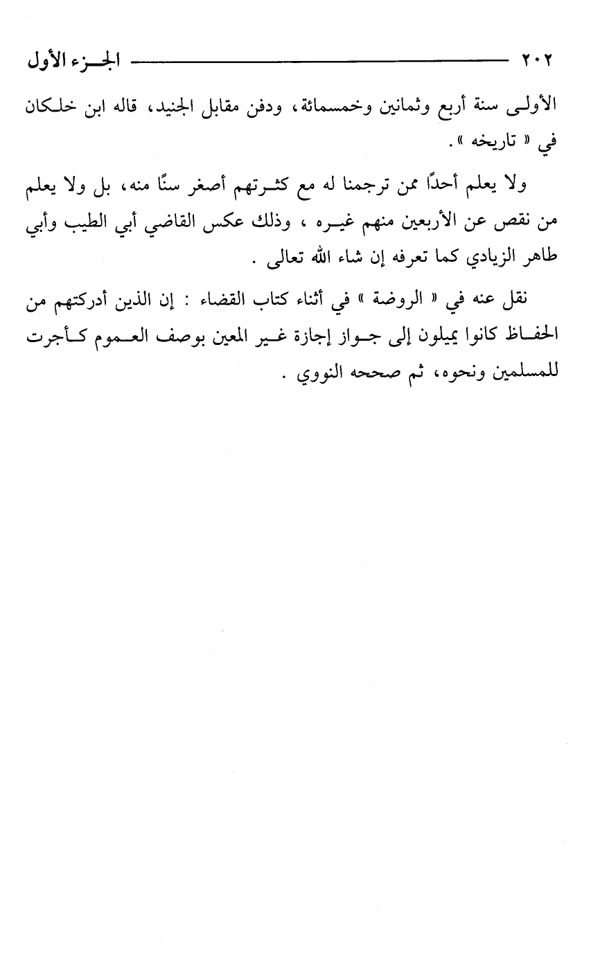 ولا يعلم أحدًا ممن ترجمنا له مع كثرتهم أصغر سنًا منه، بل ولا يعلم من نقص عن الأربعين منهم غيره، وذلك عكس القاضي أبي الطيب وأبي طاهر الزيادي كما تعرفه إن شاء الله تعالى.