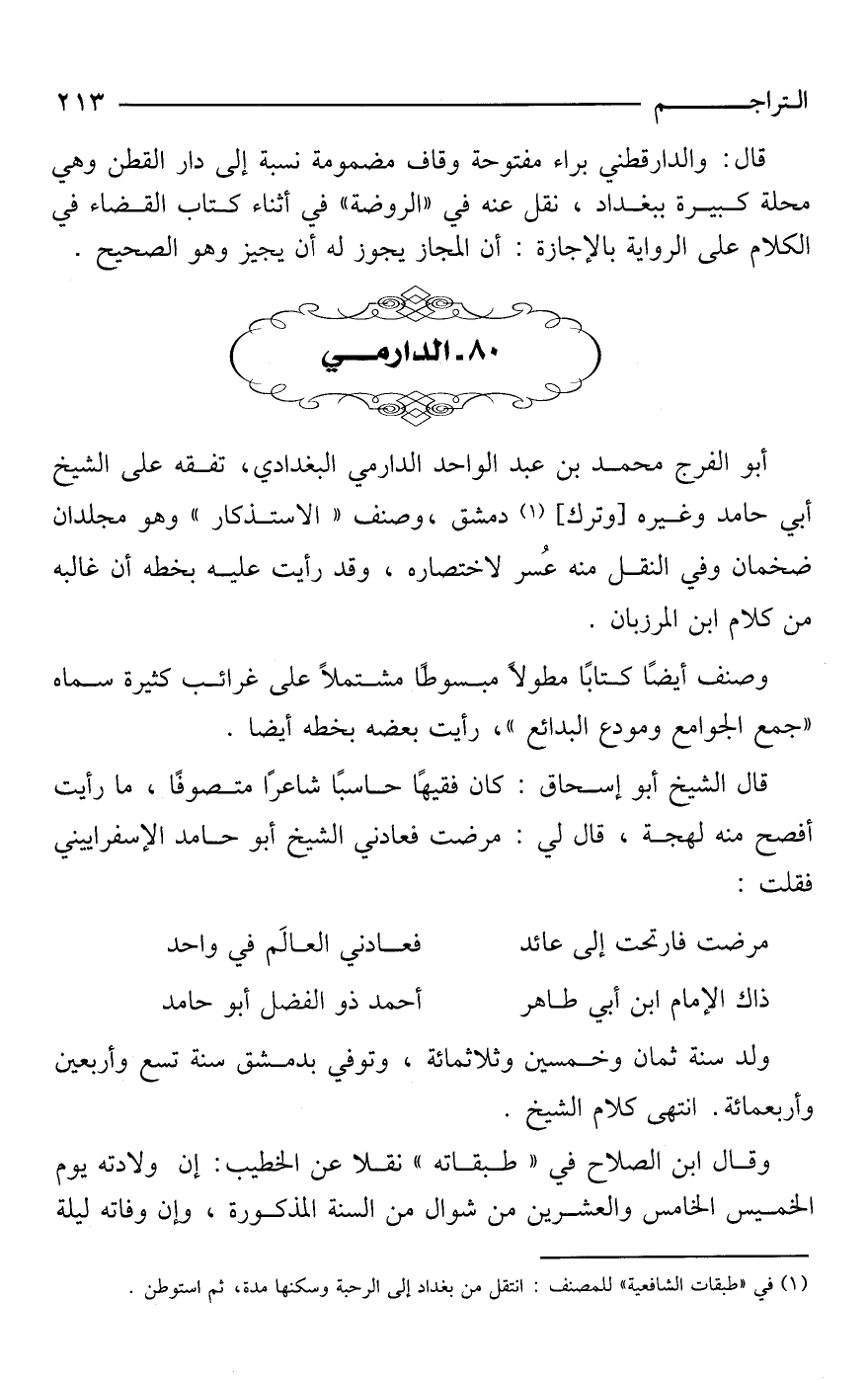 أبو الفرج محمد بن عبد الواحد الدارمي البغدادي، تفقه على الشيخ أبي حامد وغيره [وترك] (¬1) دمشق، وصنف "الاستذكار" وهو مجلدان ضخمان وفي النقل منه عُسر لاختصاره، وقد رأيت عليه بخطه أن غالبه من كلام ابن المرزبان.