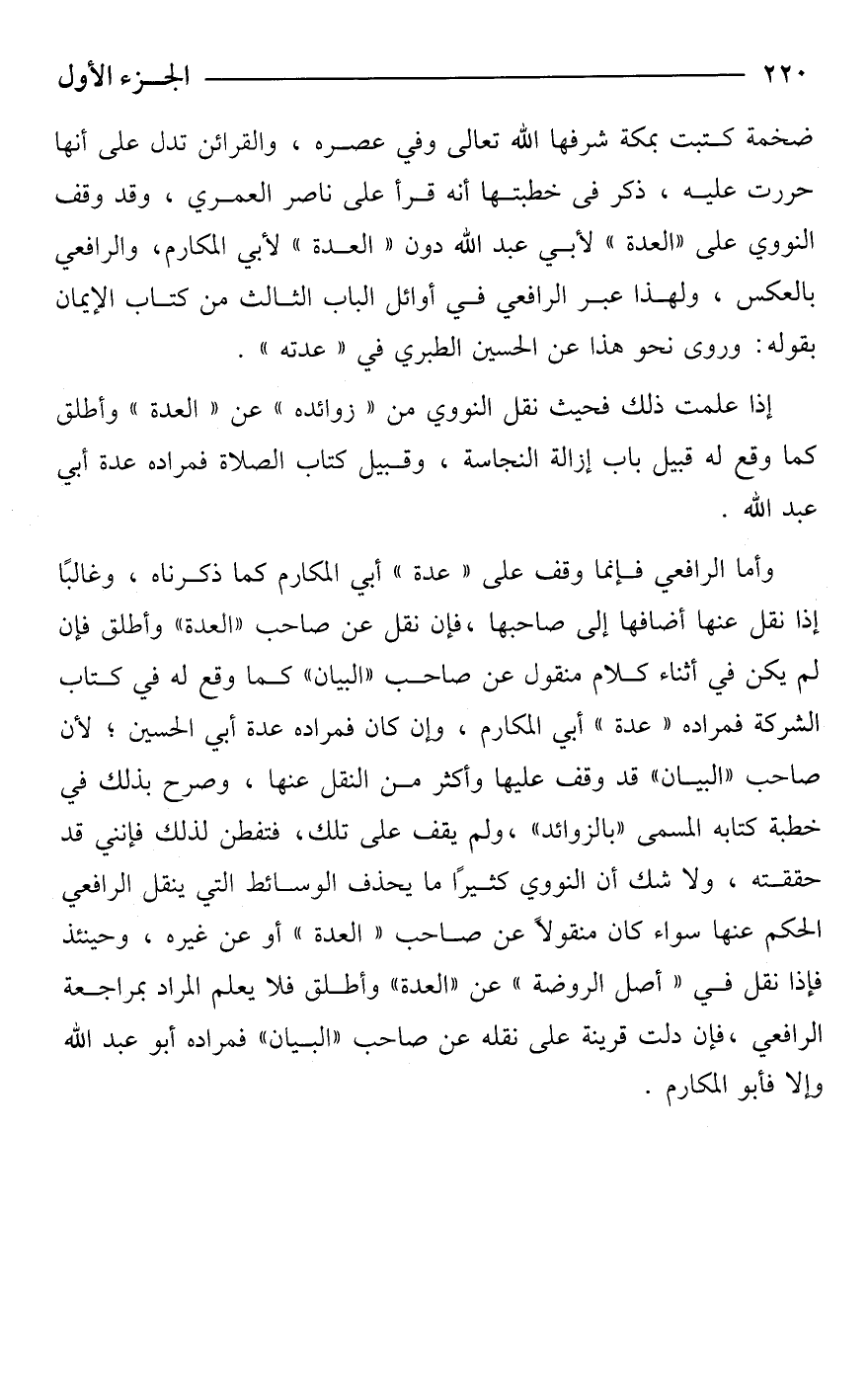 وأما الرافعي فإنما وقف على "عدة" أبي المكارم كما ذكرناه، وغالبًا إذا نقل عنها أضافها إلى صاحبها، فإن نقل عن صاحب "العدة" وأطلق فإن لم يكن في أثناء كلام منقول عن صاحب "البيان" كما وقع له في كتاب الشركة فمراده "عدة" أبي المكارم، وإن كان فمراده عدة أبي الحسين؛ لأن صاحب "البيان" قد وقف عليها وأكثر من النقل عنها، وصرح بذلك في خطبة كتابه المسمى "بالزوائد"، ولم يقف على تلك، فتفطن لذلك فإنني قد حققته، ولا شك أن النووي كثيرًا ما يحذف الوسائط التي ينقل الرافعي الحكم عنها سواء كان منقولًا عن صاحب "العدة" أو عن غيره، وحينئذ فإذا نقل في "أصل الروضة" عن "العدة" وأطلق فلا يعلم المراد بمراجعة الرافعي، فإن دلت قرينة على نقله عن صاحب "البيان" فمراده أبو عبد الله وإلا فأبو المكارم.