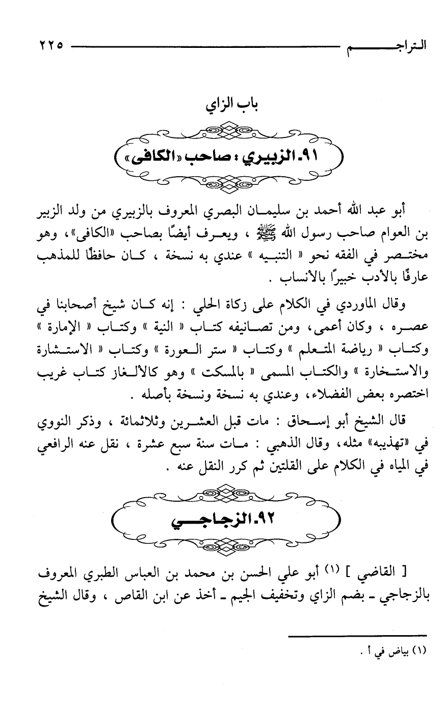 أبو عبد الله أحمد بن سليمان البصري المعروف بالزبيري من ولد الزبير بن العوام صاحب رسول الله - صَلَّى اللَّهُ عَلَيْهِ وَسَلَّمَ -، ويعرف أيضًا بصاحب "الكافي"، وهو مختصر في الفقه نحو "التنبيه" عندي به نسخة، كان حافظًا للمذهب عارفًا بالأدب خبيرًا بالأنساب.