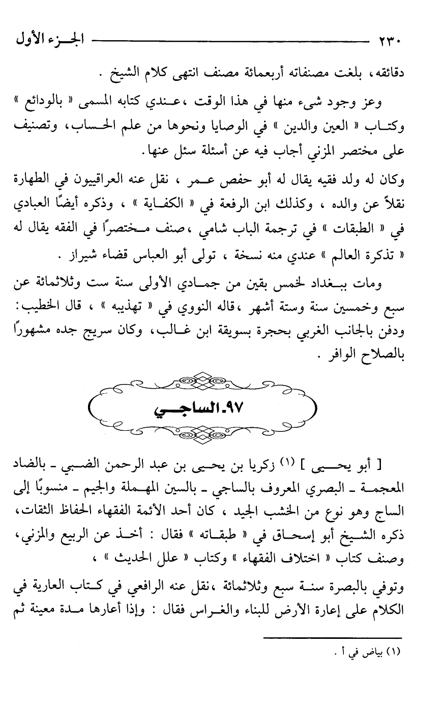[أبو يحيى] (¬1) زكريا بن يحيى بن عبد الرحمن الضبي -بالضاد المعجمة- البصري المعروف بالساجي -بالسين المهملة والجيم- منسوبًا إلى الساج وهو نوع من الخشب الجيد، كان أحد الأئمة الفقهاء الحفاظ الثقات، ذكره الشيخ أبو إسحاق في "طبقاته" فقال: أخذ عن الربيع والمزني، وصنف كتاب "اختلاف الفقهاء" وكتاب "علل الحديث"، وتوفي بالبصرة سنة سبع وثلاثمائة، نقل عنه الرافعي في كتاب العارية في الكلام على إعارة الأرض للبناء والغراس فقال: وإذا أعارها مدة معينة ثم