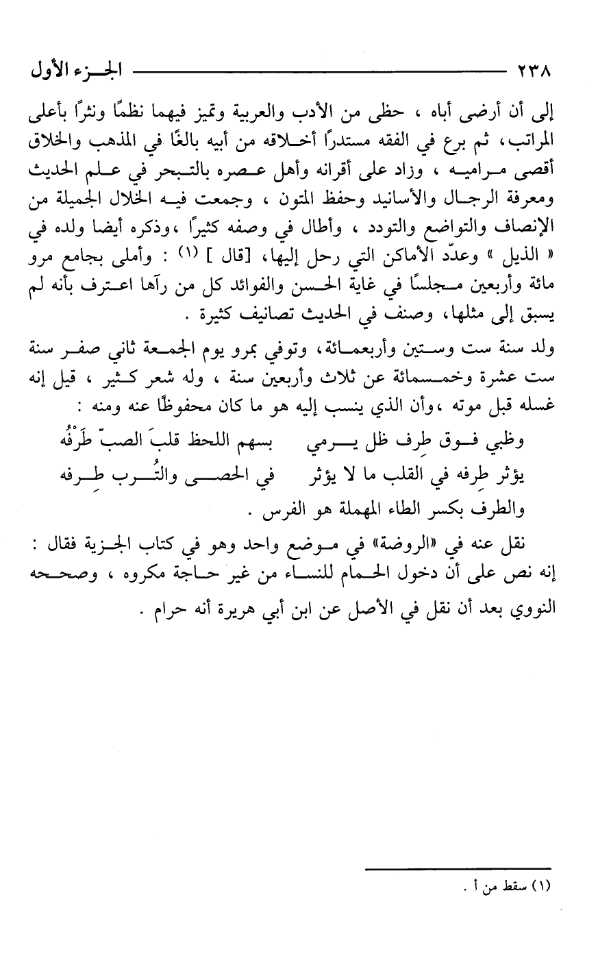 نقل عنه في "الروضة" في موضع واحد وهو في كتاب الجزية فقال: إنه نص على أن دخول الحمام للنساء من غير حاجة مكروه، وصححه النووي بعد أن نقل في الأصل عن ابن أبي هريرة أنه حرام.