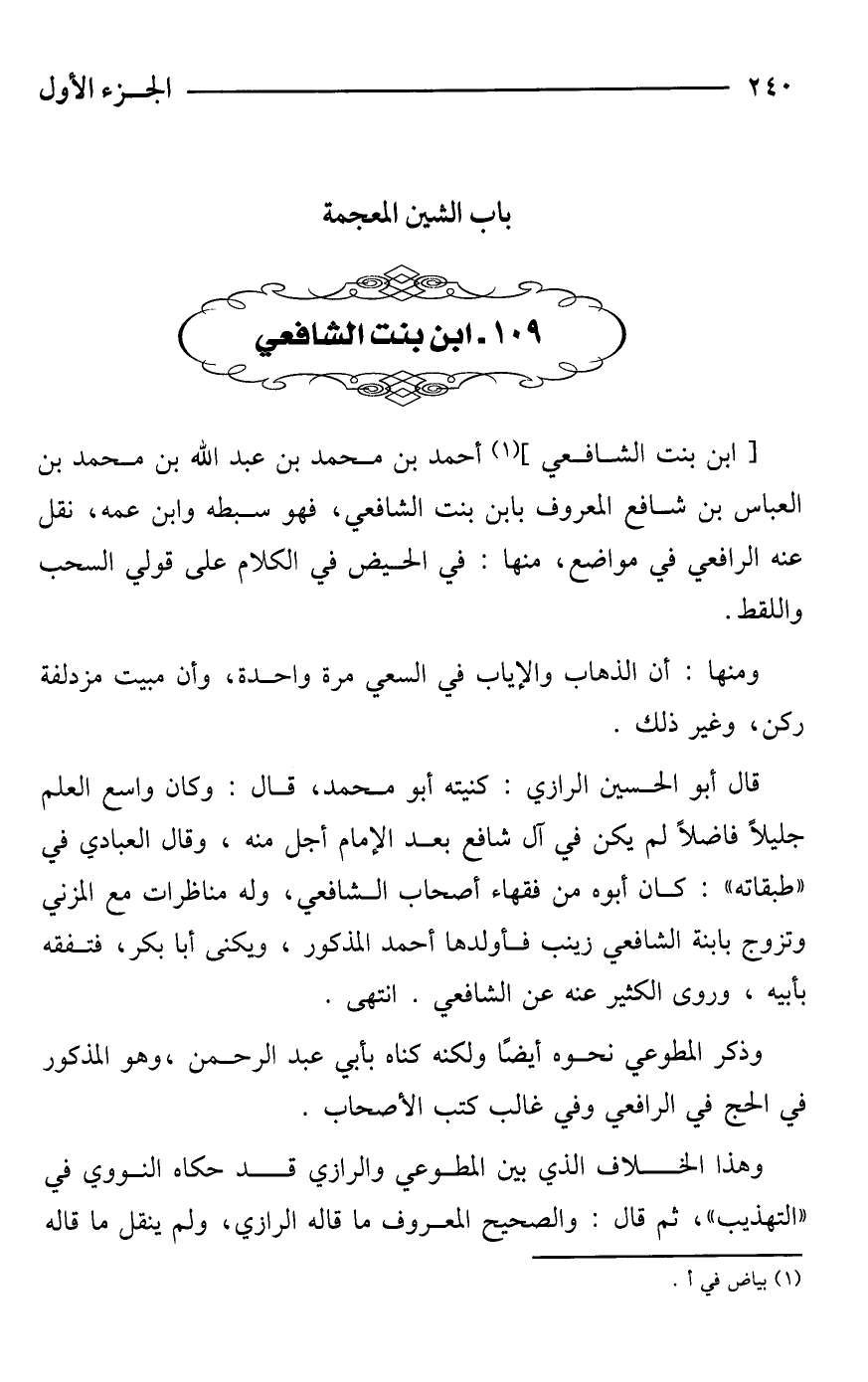 [ابن بنت الشافعي] (¬1) أحمد بن محمد بن عبد الله بن محمد بن العباس بن شافع المعروف بابن بنت الشافعي، فهو سبطه وابن عمه، نقل عنه الرافعي في مواضع، منها: في الحيض في الكلام على قولي السحب واللقط.