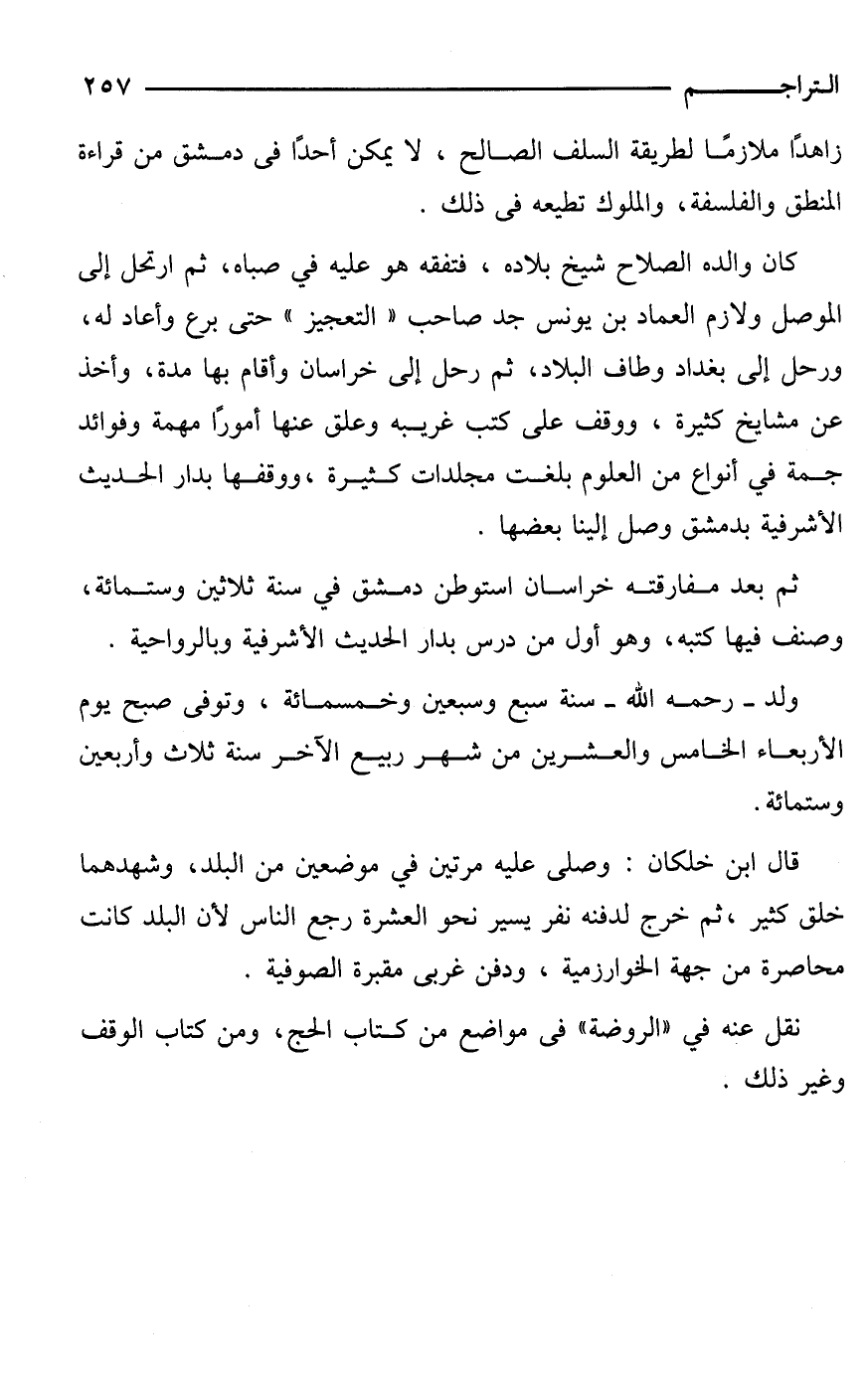 زاهدًا ملازمًا لطريقة السلف الصالح، لا يمكن أحدًا فى دمشق من قراءة المنطق والفلسفة، والملوك تطيعه في ذلك.