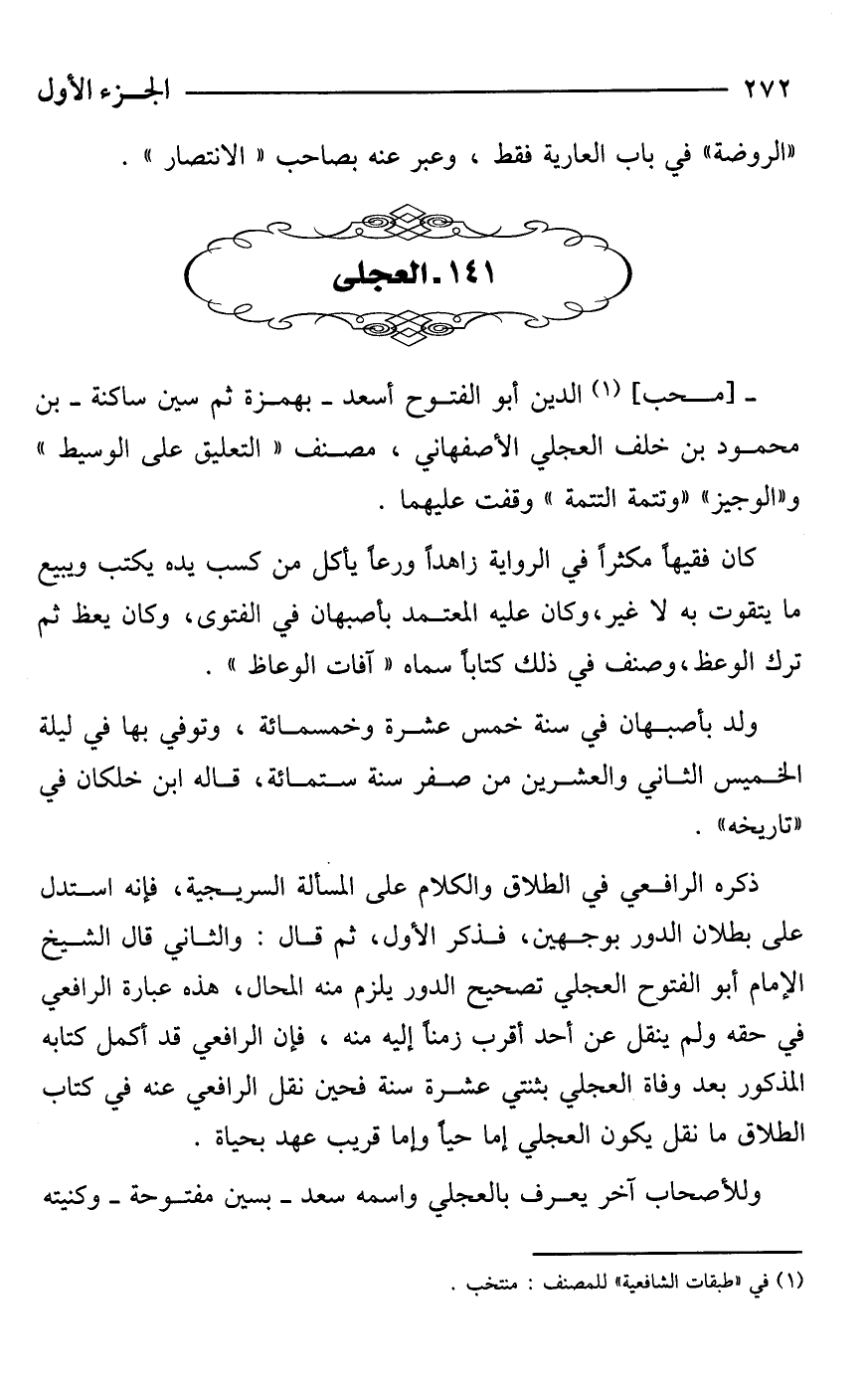 ذكره الرافعي في الطلاق والكلام على المسألة السريجية، فإنه استدل على بطلان الدور بوجهين، فذكر الأول، ثم قال: والثاني قال الشيخ الإمام أبو الفتوح العجلي تصحيح الدور يلزم منه المحال، هذه عبارة الرافعي في حقه ولم ينقل عن أحد أقرب زمنًا إليه منه، فإن الرافعي قد أكمل كتابه المذكور بعد وفاة العجلي بثنتي عشرة سنة فحين نقل الرافعي عنه في كتاب الطلاق ما نقل يكون العجلي إما حيًا وإما قريب عهد بحياة.