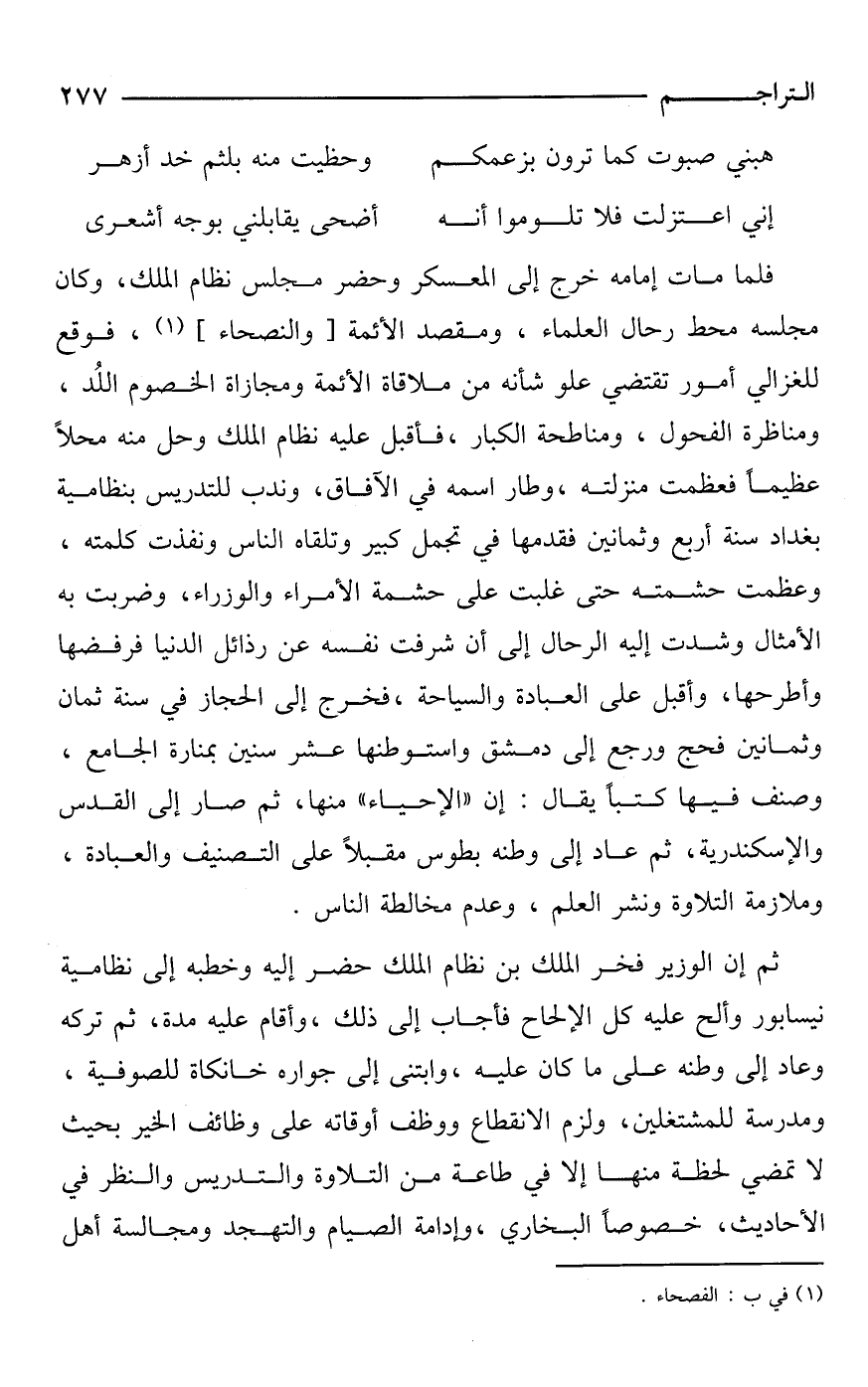 فلما مات إمامه خرج إلى المعسكر وحضر مجلس نظام الملك، وكان مجلسه محط رحال العلماء، ومقصد الأئمة [والنصحاء] (¬1)، فوقع للغزالي أمور تقتضي علو شأنه من ملاقاة الأئمة ومجازاة الخصوم اللُد، ومناظرة الفحول، ومناطحة الكبار، فأقبل عليه نظام الملك وحل منه محلًا عظيمًا فعظمت منزلته، وطار اسمه في الآفاق، وندب للتدريس بنظامية بغداد سنة أربع وثمانين فقدمها في تجمل كبير وتلقاه الناس ونفذت كلمته، وعظمت حشمته حتى غلبت على حشمة الأمراء والوزراء، وضربت به الأمثال وشدت إليه الرحال إلى أن شرفت نفسه عن رذائل الدنيا فرفضها وأطرحها، وأقبل على العبادة والسياحة، فخرج إلى الحجاز في سنة ثمان وثمانين فحج ورجع إلى دمشق واستوطنها عشر سنين بمنارة الجامع، وصنف فيها كتبًا يقال: إن "الإحياء" منها، ثم صار إلى القدس والإسكندرية، ثم عاد إلى وطنه بطوس مقبلًا على التصنيف والعبادة، وملازمة التلاوة ونشر العلم، وعدم مخالطة الناس.