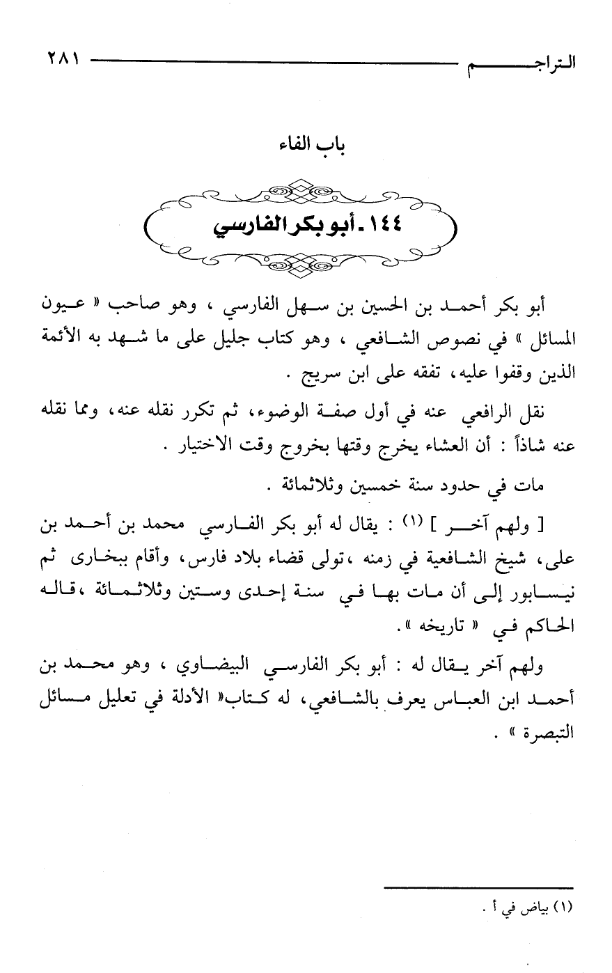 ولهم آخر يقال له: أبو بكر الفارسي البيضاوي، وهو محمد بن أحمد ابن العباس يعرف بالشافعي، له كتاب "الأدلة في تعليل مسائل التبصرة".