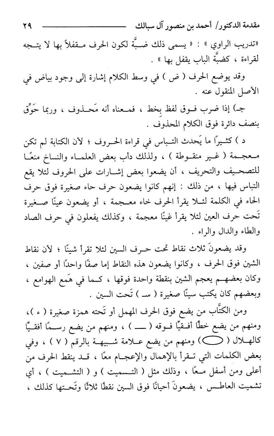 وقد يوضع الحرف (ض) في وسط الكلام إشارة إلى وجود بياض في الأصل المنقول عنه.