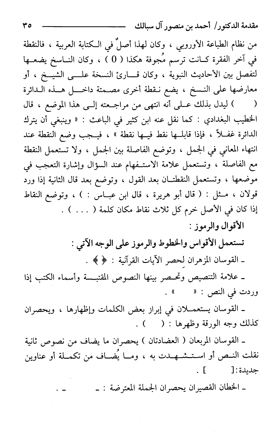 - القوسان المربعان (العضادتان) يحصران ما يضاف من نصوص ثانية نقلت النص أو استشهدت به، وما يُضاف من تكملة أو عناوين جديدة: [].