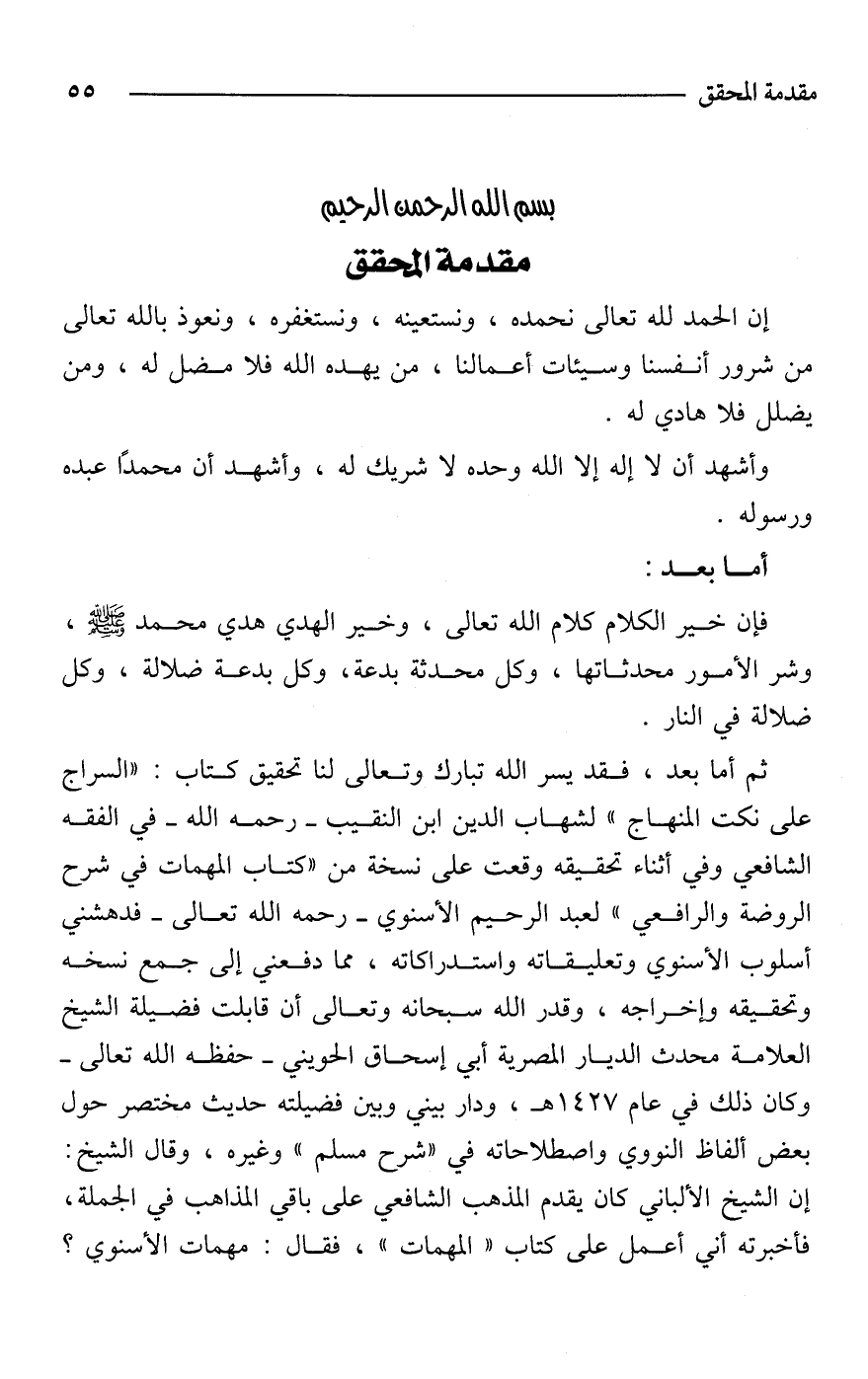 ثم أما بعد، فقد يسر الله تبارك وتعالى لنا تحقيق كتاب: "السراج على نكت المنهاج" لشهاب الدين ابن النقيب -رحمه الله- في الفقه الشافعي وفي أثناء تحقيقه وقعت على نسخة من "كتاب المهمات في شرح الروضة والرافعي" لعبد الرحيم الأسنوي -رحمه الله تعالى- فدهشني أسلوب الأسنوي وتعليقاته واستدراكاته، مما دفعني إلى جمع نسخه وتحقيقه وإخراجه، وقدر الله سبحانه وتعالى أن قابلت فضيلة الشيخ العلامة محدث الديار المصرية أبي إسحاق الحويني -حفظه الله تعالى- وكان ذلك في عام 1427 هـ، ودار بيني وبين فضيلته حديث مختصر حول بعض ألفاظ النووي واصطلاحاته في "شرح مسلم" وغيره، وقال الشيخ: إن الشيخ الألباني كان يقدم المذهب الشافعي على باقي المذاهب في الجملة، فأخبرته أني أعمل على كتاب "المهمات"، فقال: مهمات الأسنوي؟