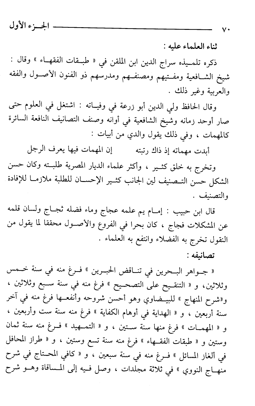 وقال الحافظ ولي الدين أَبو زرعة في وفياته: اشتغل في العلوم حتى صار أوحد زمانه وشيخ الشافعية في أوانه وصنف التصانيف النافعة السائرة كالمهمات، وفي ذلك يقول والدي من أبيات: