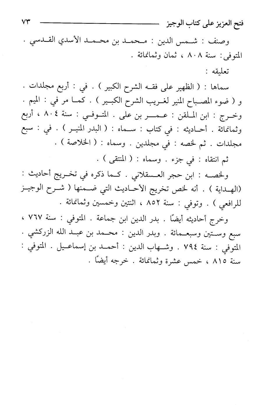 سماها: (الظهير على فقه الشرح الكبير). في: أربع مجلدات. و (ضوء المصباح المنير لغريب الشرح الكبير). كما مر في: الميم. وخرج: ابن الملقن: عمر بن علي. المتوفي: سنة 804، أربع وثمانمائة. أحاديثه: في كتاب: سماه: (البدر المنير). في: سبع مجلدات. ثم لخصه: في مجلدين. وسماه: (الخلاصة).