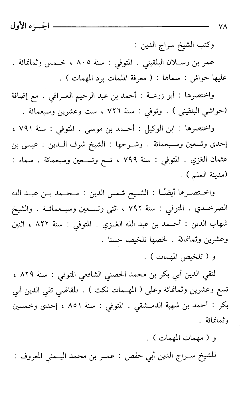 عمر بن رسلان البلقيني. المتوفي: سنة 805، خمس وثمانمائة. عليها حواش: سماها: (معرفة الملمات برد المهمات).