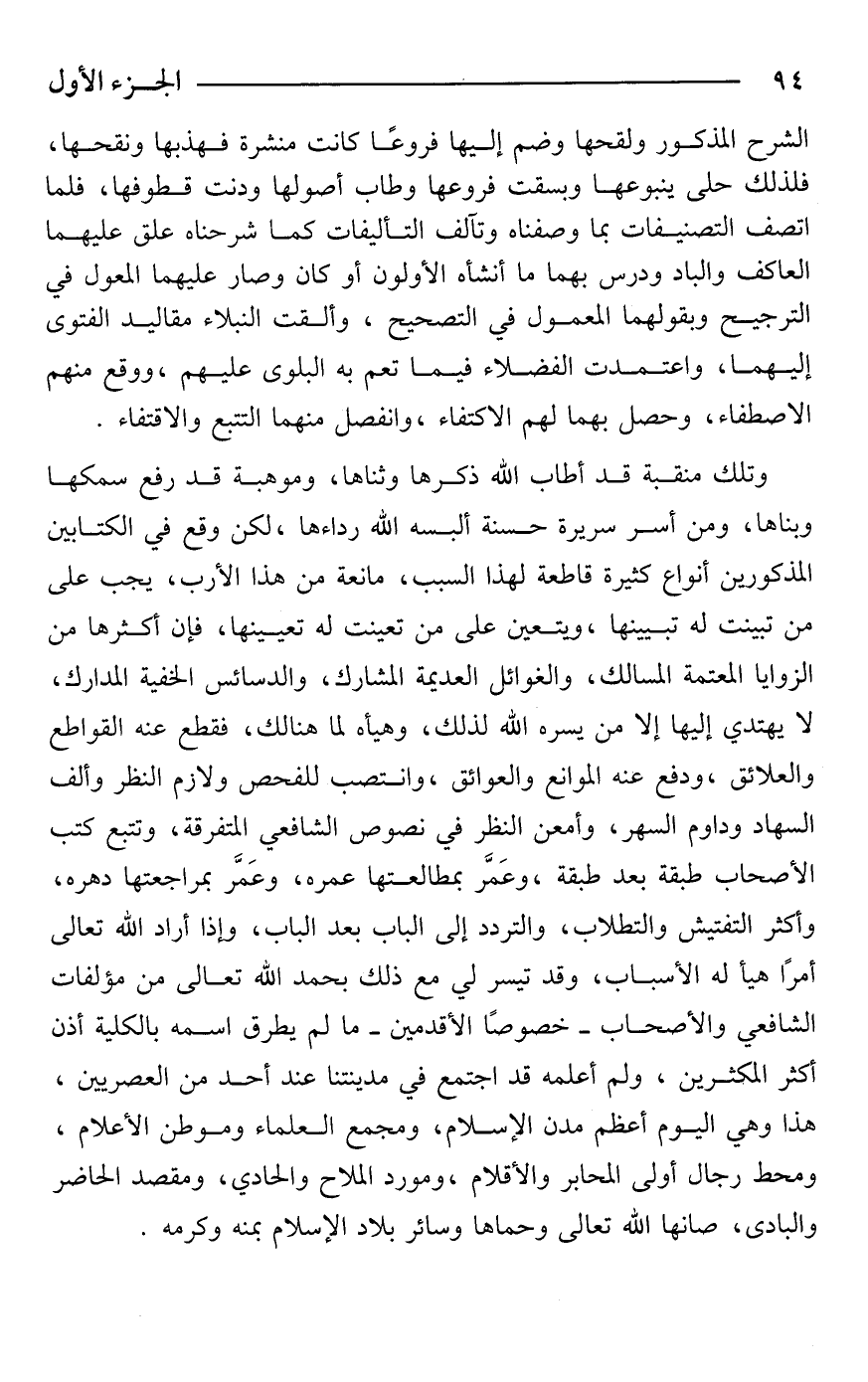 وتلك منقبة قد أطاب الله ذكرها وثناها، وموهبة قد رفع سمكها وبناها، ومن أسر سريرة حسنة ألبسه الله رداءها، لكن وقع في الكتابين المذكورين أنواع كثيرة قاطعة لهذا السبب، مانعة من هذا الأرب، يجب على من تبينت له تبيينها، ويتعين على من تعينت له تعيينها، فإن أكثرها من الزوايا المعتمة المسالك، والغوائل العديمة المشارك، والدسائس الخفية المدارك، لا يهتدي إليها إلا من يسره الله لذلك، وهيأه لما هنالك، فقطع عنه القواطع والعلائق، ودفع عنه الموانع والعوائق، وانتصب للفحص ولازم النظر وألف السهاد وداوم السهر، وأمعن النظر في نصوص الشافعي المتفرقة، وتتبع كتب الأصحاب طبقة بعد طبقة، وعَمَّر بمطالعتها عمره، وعَمَّر بمراجعتها دهره، وأكثر التفتيش والتطلاب، والتردد إلى الباب بعد الباب، وإذا أراد الله تعالى أمرًا هيأ له الأسباب، وقد تيسر لي مع ذلك بحمد الله تعالى من مؤلفات الشافعي والأصحاب -خصوصًا الأقدمين- ما لم يطرق اسمه بالكلية أذن أكثر المكثرين، ولم أعلمه قد اجتمع في مدينتنا عند أحد من العصريين، هذا وهي اليوم أعظم مدن الإسلام، ومجمع العلماء وموطن الأعلام، ومحط رجال أولى المحابر والأقلام، ومورد الملاح والحادي، ومقصد الحاضر والبادى، صانها الله تعالى وحماها وسائر بلاد الإسلام بمنه وكرمه.
