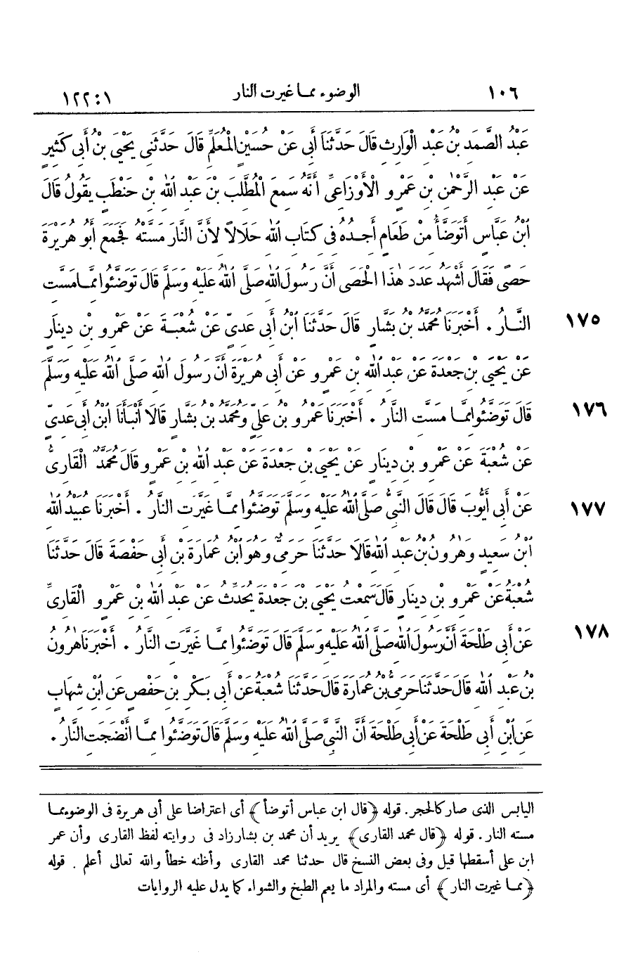 [174] قَالَ بن عَبَّاس أتوضأ أَي اعتراضا على أبي هُرَيْرَة فِي الْوضُوء مِمَّا مسته النَّار قَوْله قَالَ مُحَمَّد الْقَارئ يُرِيد أَن مُحَمَّد بن بشار زَاد فِي رِوَايَته لفظ الْقَارئ وَأَن عمر بن عَليّ أسقطها قيل وَفِي بعض النّسخ قَالَ حَدثنَا مُحَمَّد الْقَارئ وَأَظنهُ خطأ وَالله تَعَالَى أعلم قَوْله مِمَّا غيرت النَّار أَي مسته وَالْمرَاد مَا يعم الطَّبْخ والشواء كَمَا يدل عَلَيْهِ الرِّوَايَات