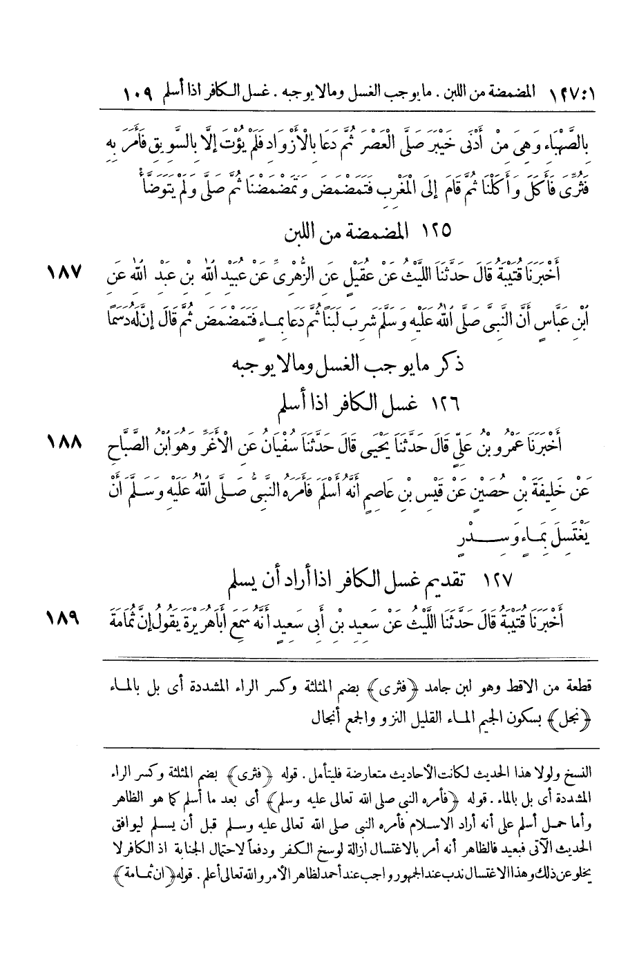 [185] كَانَ آخر الْأَمريْنِ أَي تحقق الْأَمر أَن الْوضُوء وَالتّرْك لَكِن كَانَ آخرهما التّرْك وَهَذَا نَص فِي النّسخ وَلَوْلَا هَذَا الحَدِيث لكَانَتْ الْأَحَادِيث متعارضة فَلْيتَأَمَّل قَوْله فَثُرِّيَ بِضَمِّ الْمُثَلَّثَةِ وَكَسْرِ الرَّاءِ الْمُشَدَّدَةِ أَيْ بل بِالْمَاءِ قَوْله فَأمره النَّبِي صلى الله تَعَالَى عَلَيْهِ وَسلم أَي بعد مَا أسلم كَمَا هُوَ الظَّاهِر وَأما حمل أسلم على أَنه أَرَادَ الْإِسْلَام فَأمره النَّبِي صلى الله تَعَالَى عَلَيْهِ وَسلم قبل أَن يسلم ليُوَافق الحَدِيث الْآتِي فبعيد فَالظَّاهِر أَنه أَمر بالاغتسال إِزَالَة لوسخ الْكفْر ودفعا لاحْتِمَال الْجَنَابَة إِذْ الْكَافِر لَا يَخْلُو عَن ذَلِك وَهَذَا الِاغْتِسَال ندب عِنْد الْجُمْهُور وَاجِب عِنْد احْمَد لظَاهِر الْأَمر وَالله تَعَالَى أعلم