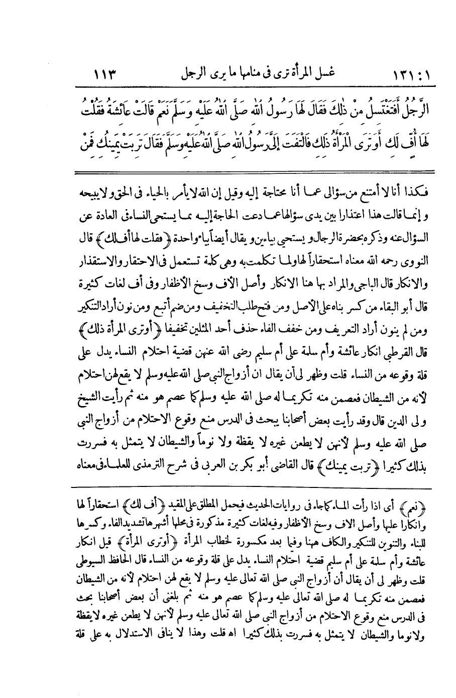 نعم أَي إِذا رَأَتْ المَاء كَمَا جَاءَ فِي رِوَايَات الحَدِيث فَيحمل الْمُطلق على الْمُقَيد أُفٍّ لَك استحقارا لَهَا وانكارا عَلَيْهَا وأصل آلَاف وسخ الْأَظْفَار وَفِيه لُغَات كَثِيرَة مَذْكُورَة فِي محلهَا أشهرها تَشْدِيد الْفَاء وَكسرهَا للْبِنَاء والتنوين للتنكير وَالْكَاف هَا هُنَا وَفِيمَا بعد مَكْسُورَة لخطاب الْمَرْأَة أَو ترى الْمَرْأَة قيل إِنْكَارُ عَائِشَةَ وَأُمِّ سَلَمَةَ عَلَى أُمِّ سُلَيْمٍ قَضِيَّةَ احْتِلَامِ النِّسَاءِ يَدُلُّ عَلَى قِلَّةِ وُقُوعِهِ من النِّسَاء قَالَ الْحَافِظ السُّيُوطِيّ قُلْتُ وَظَهَرَ لِي أَنْ يُقَالَ إِنَّ أَزْوَاجَ النَّبِي صلى الله تَعَالَى عَلَيْهِ وَسَلَّمَ لَا يَقَعُ لَهُنَّ احْتِلَامٌ لِأَنَّهُ مِنَ الشَّيْطَانِ فَعُصِمْنَ مِنْهُ تَكْرِيمًا لَهُ صَلَّى الله تَعَالَى عَلَيْهِ وَسَلَّمَ كَمَا عُصِمَ هُوَ مِنْهُ ثُمَّ بَلغنِي أَن بعض أَصْحَابنَا بحث فِي الدَّرْسِ مَنْعَ وُقُوعِ الِاحْتِلَامِ مِنْ أَزْوَاجِ النَّبِي صلى الله تَعَالَى عَلَيْهِ وَسلم لِأَنَّهُنَّ لَا يطعن غَيره لايقظة وَلَا نَوْمًا وَالشَّيْطَانُ لَا يَتَمَثَّلُ بِهِ فَسُرِرْتُ بذلك كثيرا اه قلت وَهَذَا لَا يُنَافِي الِاسْتِدْلَال بِهِ على قلَّة