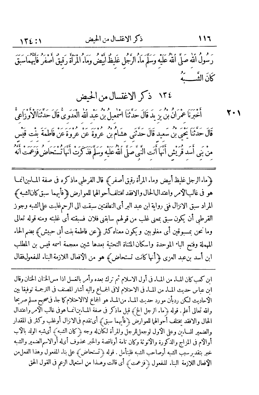 [215] عَنْ فَاطِمَةَ بِنْتِ أَبِي حُبَيْشٍ بِضَمِّ الْحَاءِ الْمُهْمَلَةِ وَفَتْحِ الْبَاءِ الْمُوَحَّدَةِ وَإِسْكَانِ الْمُثَنَّاةِ التَّحْتِيَّةِ بَعْدَهَا شِينٌ مُعْجَمَةٌ اسْمُهُ قَيْسُ بْنُ الْمُطَّلِبِ بْنِ أَسَدِ بْنِ عَبْدِ الْعُزَّى أَنَّهَا كَانَتْ تُسْتَحَاضُ هُوَ مِنَ الْأَفْعَالِ اللَّازِمَةِ الْبِنَاءَ لِلْمَفْعُولِ فَقَالَ الشَّيْخُ وَلِيُّ الدِّينِ الْعِرَاقِيُّ فِي شَرْحِ أَبِي دَاوُدَ اعْلَمْ أَنَّ اللَّاتِي ذُكِرَ أَنَّهُنَّ اُسْتُحِضْنَ عَلَى عَهْدِ رَسُولِ اللَّهِ صَلَّى اللَّهُ عَلَيْهِ وَسَلَّمَ تِسْعٌ فَاطِمَةُ هَذِهِ وَأُمُّ حَبِيبَةَ بِنْتُ جَحْشٍ وَأُخْتُهَا حَمْنَةُ وَأُخْتُهَا زَيْنَبُ أُمُّ الْمُؤْمِنِينَ إِنْ صَحَّ وَسَهْلَةُ بِنْتُ سَهْلٍ وَسَوْدَةُ أُمُّ الْمُؤْمِنِينَ وَأَسْمَاءُ بِنْتُ مَرْثَدٍ الْحَارِثِيَّةُ وَزَيْنَبُ بِنْتُ أَبِي سَلَمَةَ وَبَادِنَةُ بِنْتُ غَيْلَانَ الثَّقَفِيَّةُ قُلْتُ وَقَدْ نَظَمْتُهُنَّ فِي بَيْتَيْنِ وَهُمَا قَدِ اسْتُحِيضَتْ فِي زَمَانِ الْمُصْطَفَى تِسْعُ نِسَاءٍ قَدْ رَوَاهَا الرَّاوِيَهْ بَنَاتُ جَحْشٍ سَوْدَةُ وَالْفَاطِمَهْ زَيْنَبُ أَسْمَا سَهْلَةُ وَبَادِنَهْ