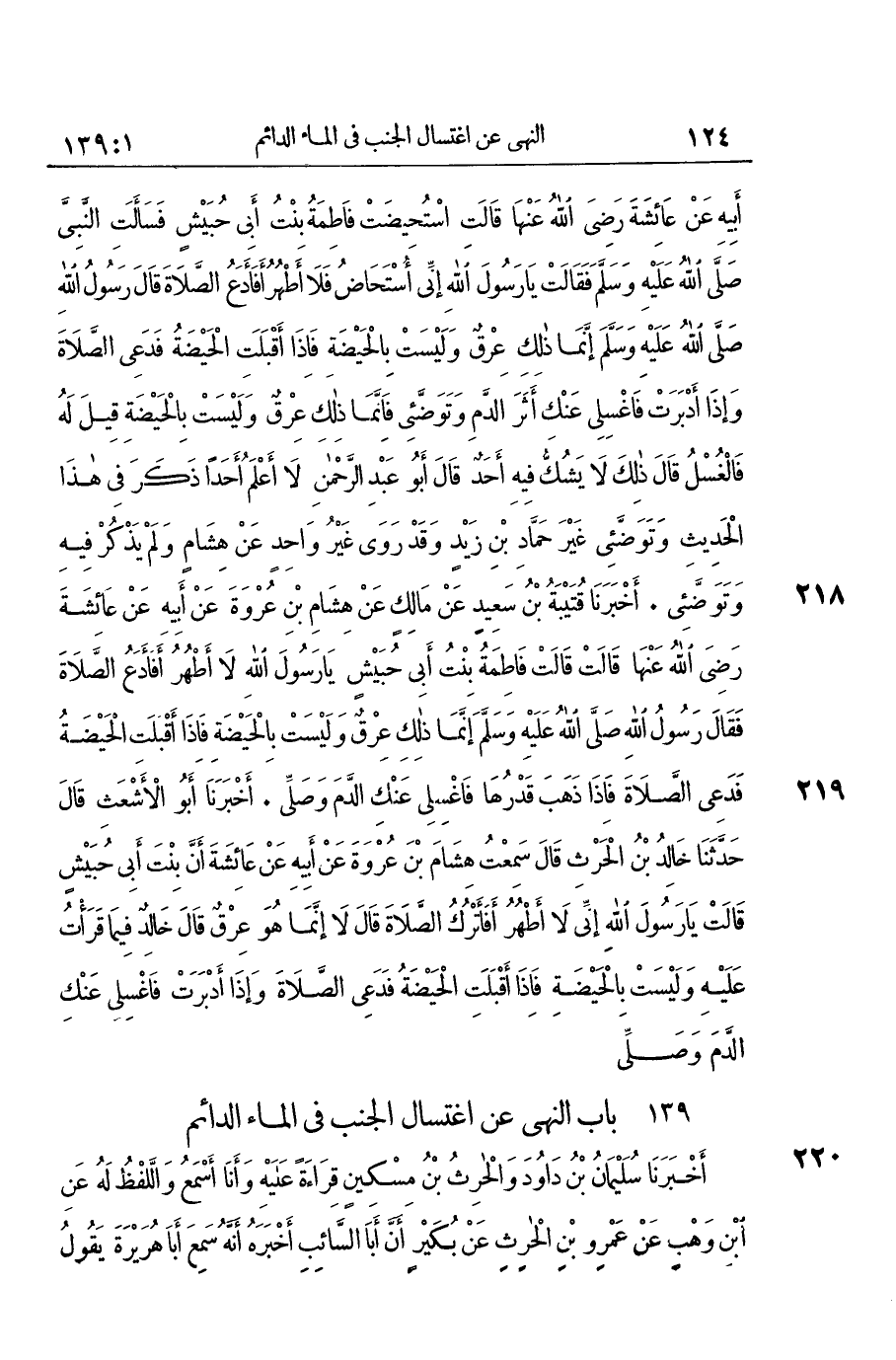 219 - أَخْبَرَنَا أَبُو الْأَشْعَثِ قَالَ: حَدَّثَنَا خَالِدُ بْنُ الْحَارِثِ قَالَ: سَمِعْتُ هِشَامَ بْنَ عُرْوَةَ، عَنْ أَبِيهِ، عَنْ عَائِشَةَ رَضِيَ اللَّهِ عَنْهَا: " أَنَّ بِنْتَ أَبِي حُبَيْشٍ قَالَتْ: يَا رَسُولَ اللَّهِ، إِنِّي §لَا أَطْهُرُ أَفَأَتْرُكُ الصَّلَاةَ؟ قَالَ: «لَا. إِنَّمَا هُوَ عِرْقٌ» - قَالَ خَالِدٌ فِيمَا قَرَأْتُ عَلَيْهِ - «وَلَيْسَتْ بِالْحَيْضَةِ، فَإِذَا أَقْبَلَتِ الْحَيْضَةُ فَدَعِي الصَّلَاةَ، وَإِذَا أَدْبَرَتْ فَاغْسِلِي عَنْكِ الدَّمَ وَصَلِّي»