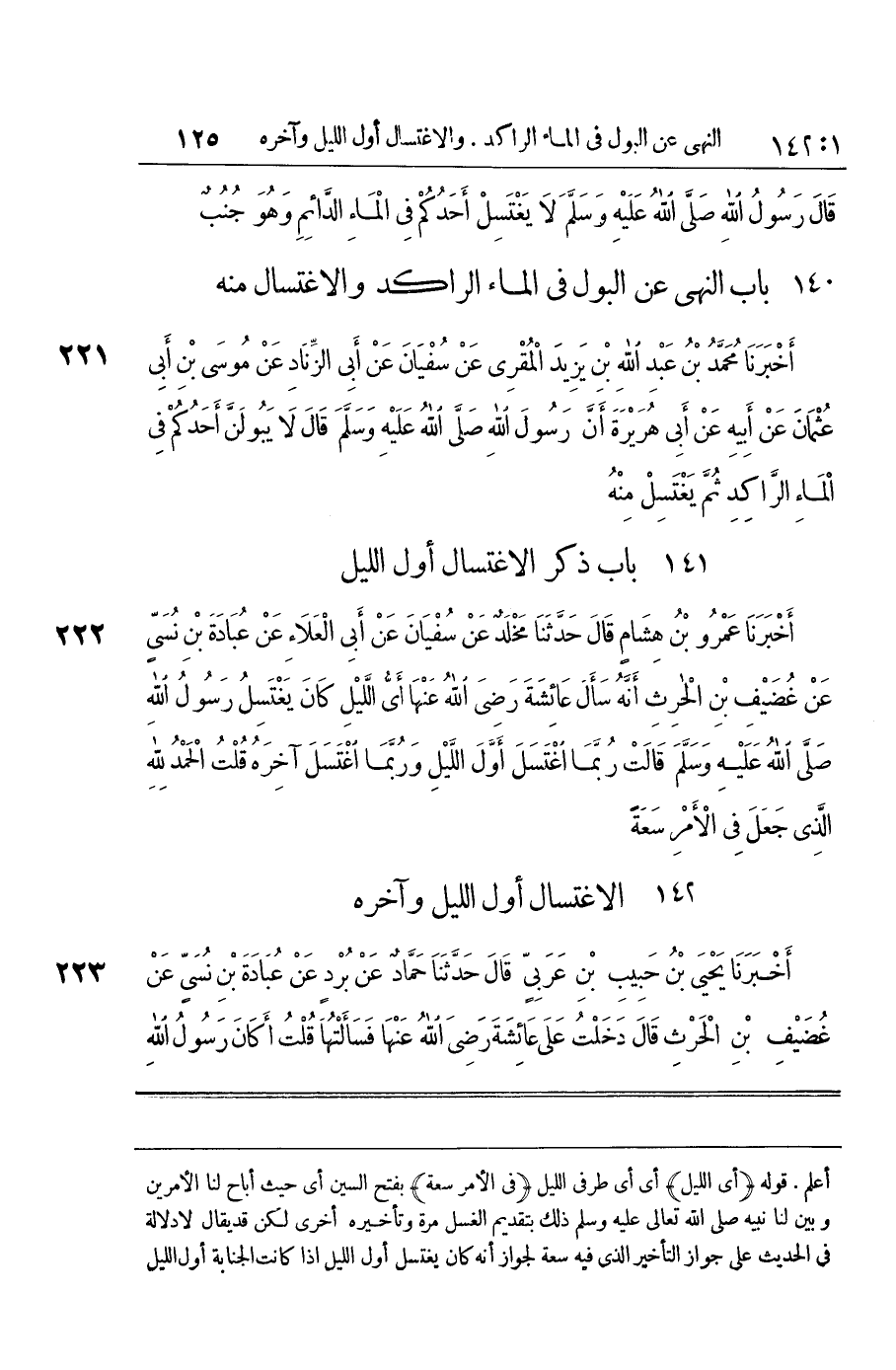 [222] أَي اللَّيْل أَي أَي طرفِي اللَّيْل فِي الْأَمر سَعَة بِفَتْح السِّين أَي حَيْثُ أَبَاحَ لنا الْأَمريْنِ وَبَين لنا نبيه صلى الله تَعَالَى عَلَيْهِ وَسلم ذَلِك بِتَقْدِيم الْغسْل مرّة وتأخيره أُخْرَى لَكِن قد يُقَال لَا دلَالَة فِي الحَدِيث على جَوَاز التَّأْخِير الَّذِي فِيهِ سَعَة لجَوَاز أَنه كَانَ يغْتَسل أول اللَّيْل إِذا كَانَت الْجَنَابَة أول اللَّيْل ويغتسل آخِره إِذا كَانَت الْجَنَابَة آخِره الا أَن يُقَال يفهم التَّأْخِير بِقَرِينَة السُّؤَال وبقرينة تَقْرِير عَائِشَة السَّائِل على قَوْله الْحَمد لله الخ فَلْيتَأَمَّل قَوْله