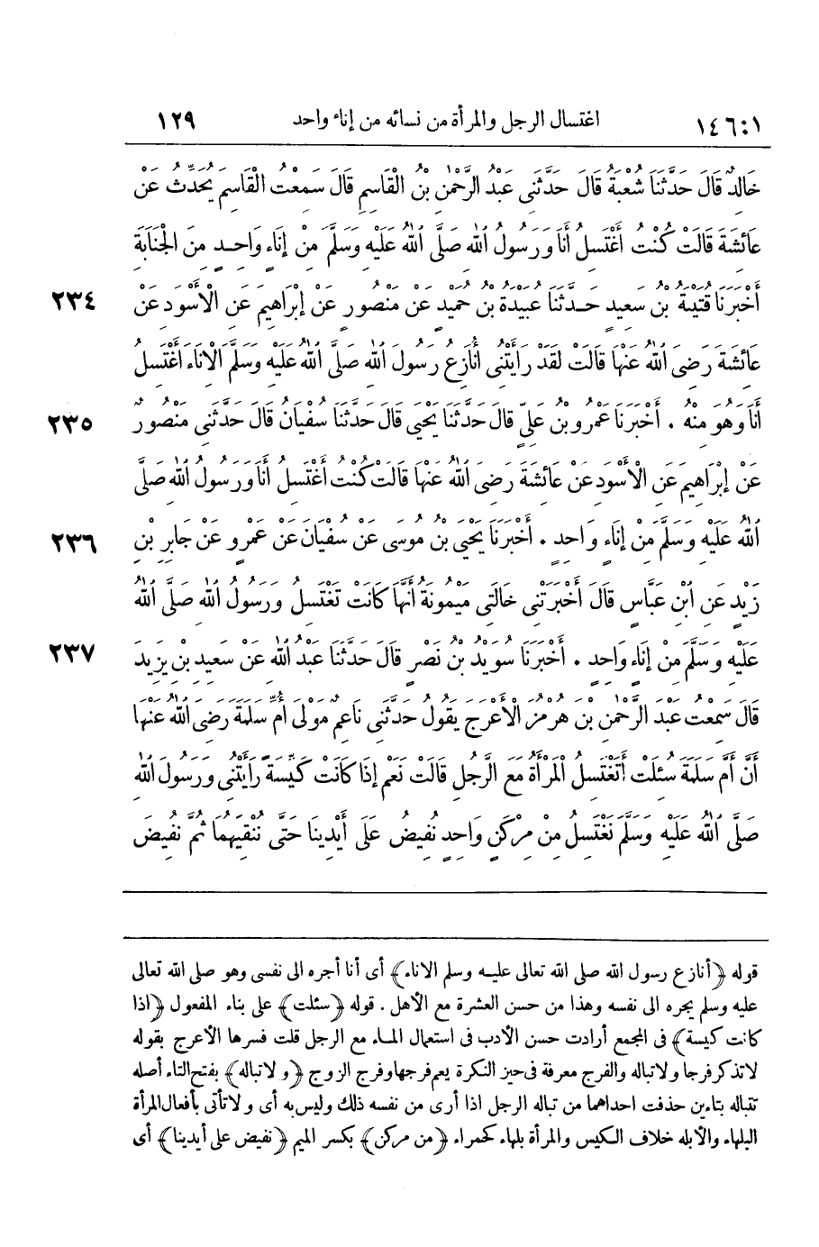 [234] أنازع رَسُول الله صلى الله تَعَالَى عَلَيْهِ وَسلم الْإِنَاء أَي أَنا أجره إِلَى نَفسِي وَهُوَ صلى الله تَعَالَى عَلَيْهِ وَسلم يجره إِلَى نَفسه وَهَذَا من حسن الْعشْرَة مَعَ الْأَهْل قَوْله سُئِلت على بِنَاء الْمَفْعُول إِذا كَانَت كيسة فِي الْمجمع أَرَادَت حسن الْأَدَب فِي اسْتِعْمَال المَاء مَعَ الرجل قلت فَسرهَا الْأَعْرَج بقوله لَا تذكر فرجا وَلَا تباله والفرج معرفَة فِي حيّز النكرَة يعم فرجهَا وَفرج الزَّوْج وَلَا تباله بِفَتْح التَّاء أَصله تتباله بتاءين حذفت إِحْدَاهمَا من تباله الرجل إِذا أرى من نَفسه ذَلِك وَلَيْسَ بِهِ أَي وَلَا تَأتي بِأَفْعَال المراة البلهاء والأبلة خلاف الْكيس وَالْمَرْأَة بلهاء كحمراء من مركن بِكَسْر الْمِيم نفيض على أَيْدِينَا أَي